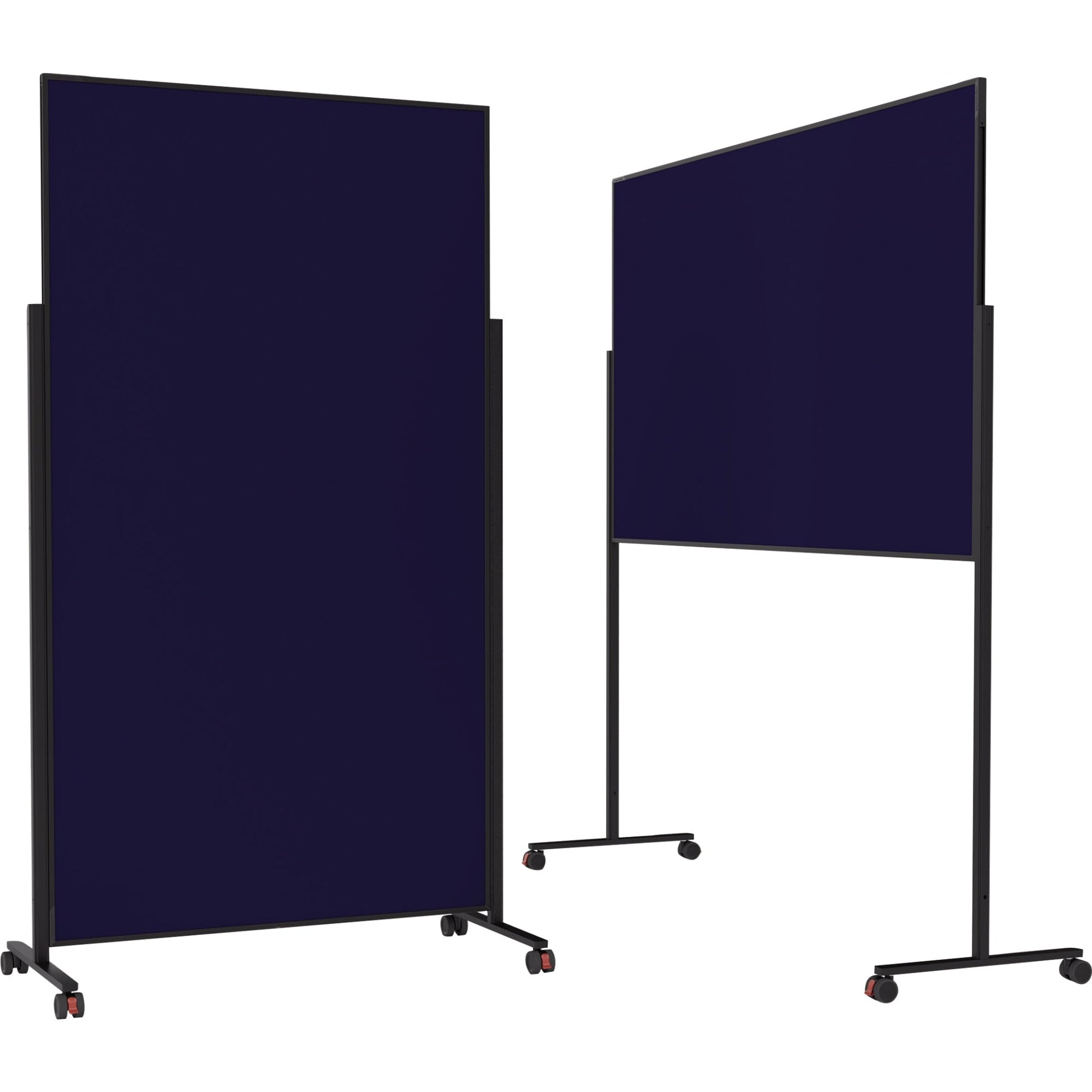 dunkelblauZeitlose Design-Pinnwände in 8 modernen Trendfarben. Die doppelseitigen Filzoberflächen sind zu 100 % aus natürlichen, nachwachsenden Rohstoffen und flammhemmend ausgestattet (zertifiziert nach DIN EN 13501-1/ B-s2,d0 – vergleichbar mit Baustoffklasse DIN 4102-1 / B1). Um möglichst vielseitige Anwendungen zu garantieren, lassen sich die die Tafeln im Hoch- oder Querformat montieren. Die Rahmen und Standfüße aus superleichtem Aluminium, sind mit weißer Pulverbeschichtung veredelt. Die modernen, eleganten Gehrungsecken in schlichtem Design entsprechen den aktuellen Arbeitssicherheits-Bestimmungen. Beigefügtes Werkzeug sorgt für schnellen Aufbau. Standsichere Fußelemente mit 4 leichtlaufenden Möbelrollen sorgen für müheloses Bewegen von Raum zu Raum.