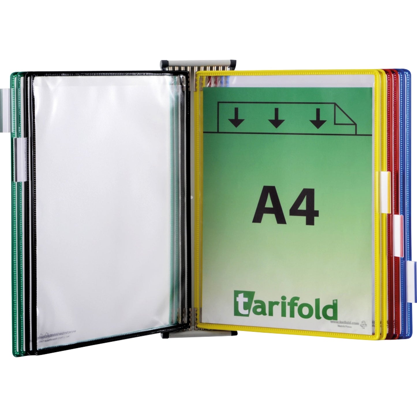 Bezeichnung: DJOIS Sichttafelwandhalter Tarifold DIN A4 inkl. 5 Aufsteckreitern Metall je 2 x blau, rot, gelb, grün, schwarz 10 Sichttafeln