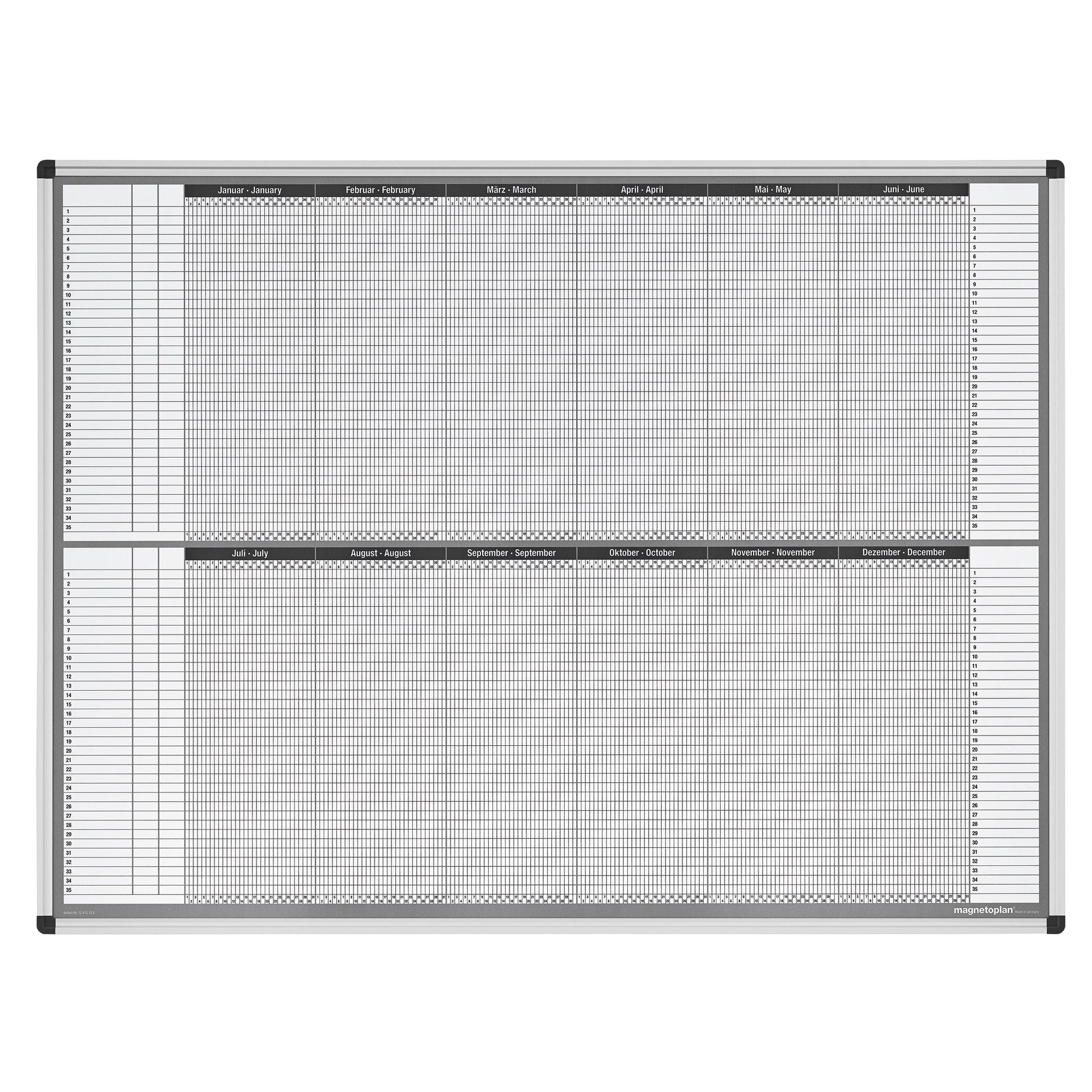 weißPlaner zur übersichtlichen Termin-, Projekt- + Personalplanung eines ganzen Jahres (Projekte, Seminare, Tagungen, Messen, Produktionsabläufe, Urlaube, Dienstreisen etc.) Verhindert Produktions-Engpässe + personelle Unterbelegungen. Mit 7-Tage-Wochen + 365-Tage-Einteilung im Halbjahres-Format. Mit trocken abwischbaren Stiften beschreibbar + wieder abwischbar. Für eine exakte Vorausplanung + Koordination: Mit waagerecht eingedruckten Monatsnamen (deutsch/englisch) inkl. Kalendarien (1-31) sowie senkrecht angeordneten Zeilennummern. Auf magnethaftenden U-Profilen mit ferrocard-Etiketten können Namen, Abteilungen oder Projekte senkrecht angeordnet werden. Mithilfe von beschreibbaren magnetoflex-Bändern lassen sich Termin-Zeiträume beliebig auflegen + verschieben. Kostensparend: Planer zur einmaligen Anschaffung, von Jahr zu Jahr nutzbar. Mit modernen, eleganten Gehrungsecken in schlichtem Design. Diese entsprechen den aktuellen Arbeits-Sicherheitsbestimmungen.