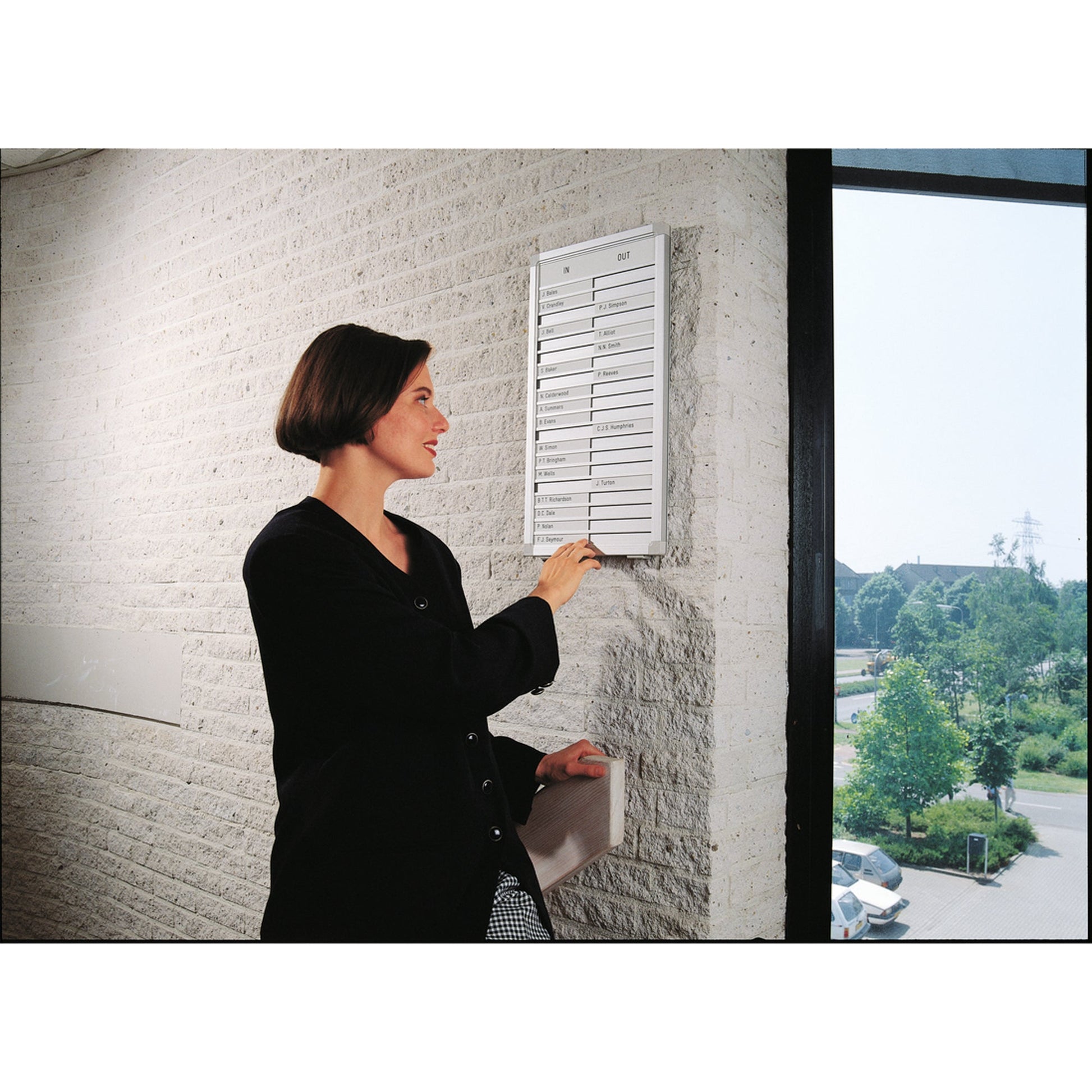 Ausführung der Lieferzusammenstellung: inkl. Namensschilder aus weißem Kunststoff blanko, in-and-out-Schild (1 x Englich, 1 x Deutsch, 1 x Französisch, 1 x Niederländisch)