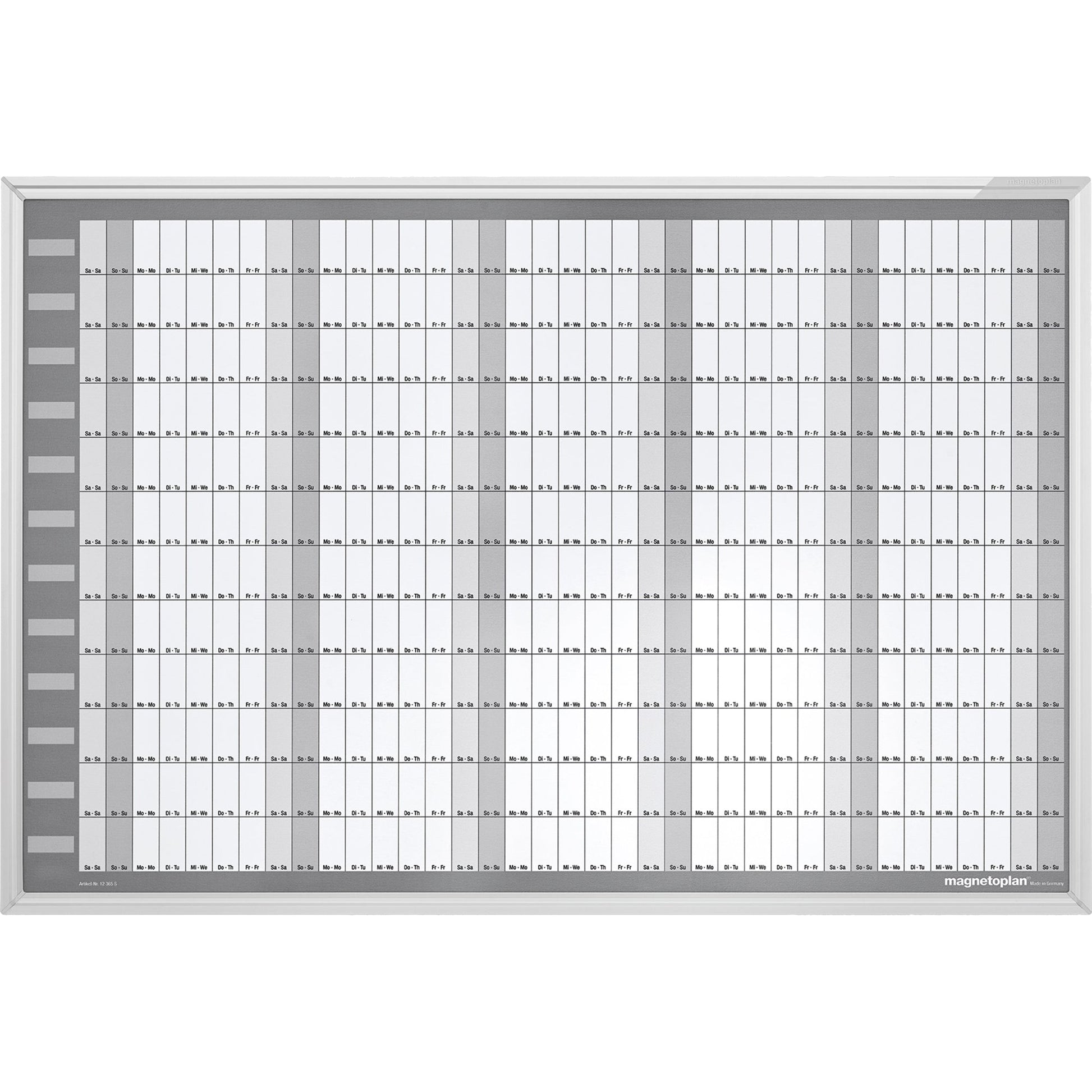 Bezeichnung: magnetoplan® Jahresplaner Manager 92 x 62,5 cm (B x H) 12 Monate inkl. 1 Boardmarker magnetisch mit Löscher, 1 wasserlöslicher Boardmarker, 1 Datumsmagnet, 12 Monatsmagnete, verschiendene Jahreszahlen, magnethaftende Kalenderstreifen Aluminium weiß