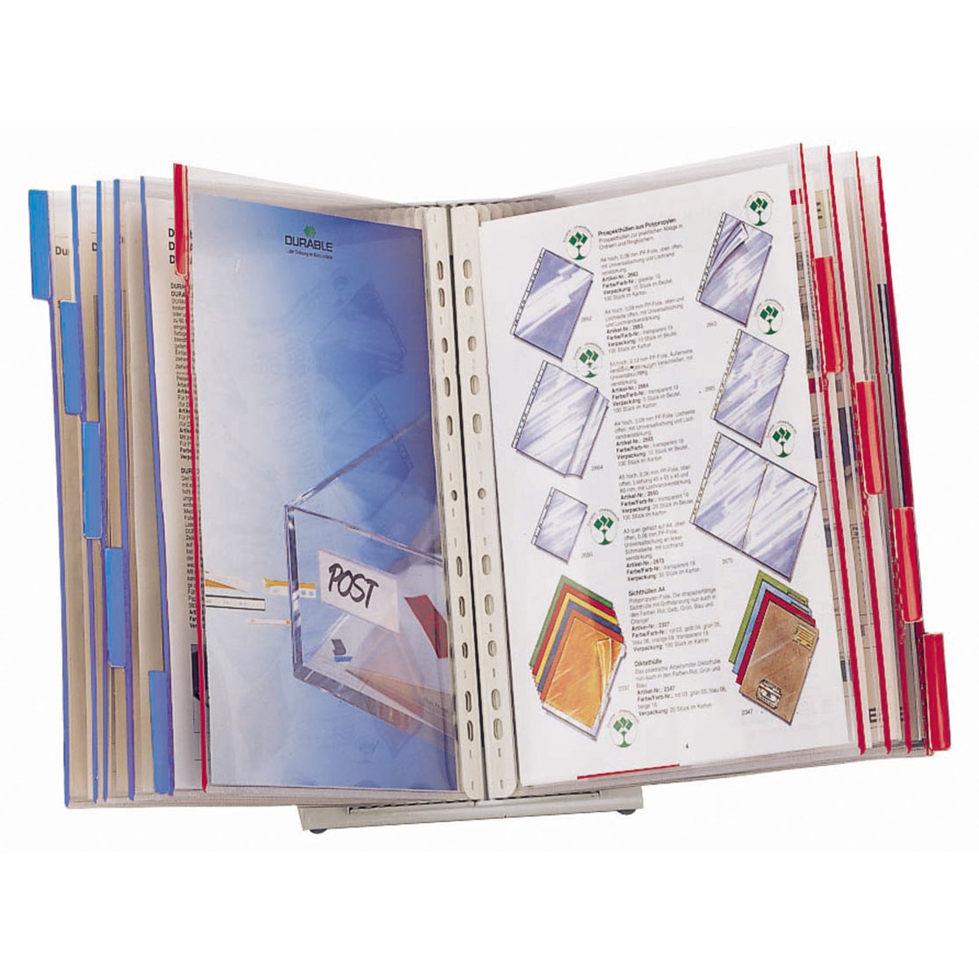 Bezeichnung: DURABLE Sichttafelständer FUNCTION TABLE 20 56,5 x 40,5 x 38 cm (B x H x T) Stahl/Polyurethan/Polyamid/PVC Anzahl der mitgelieferten Sichttafeln: 20 Sichttafeln je 5 x rot, blau, gelb, grün