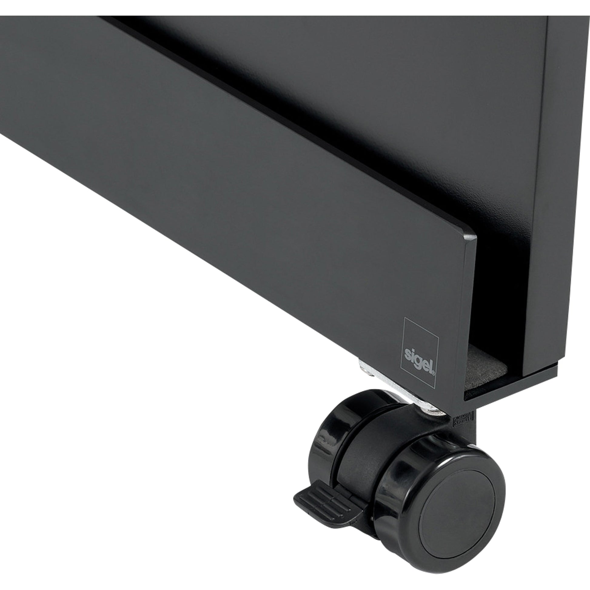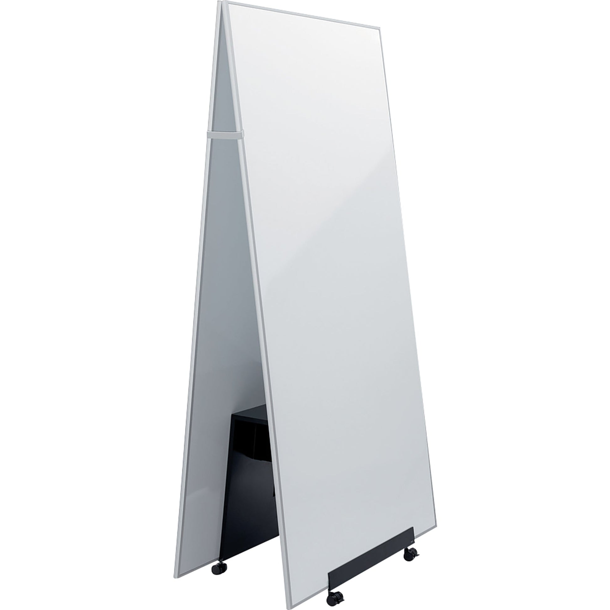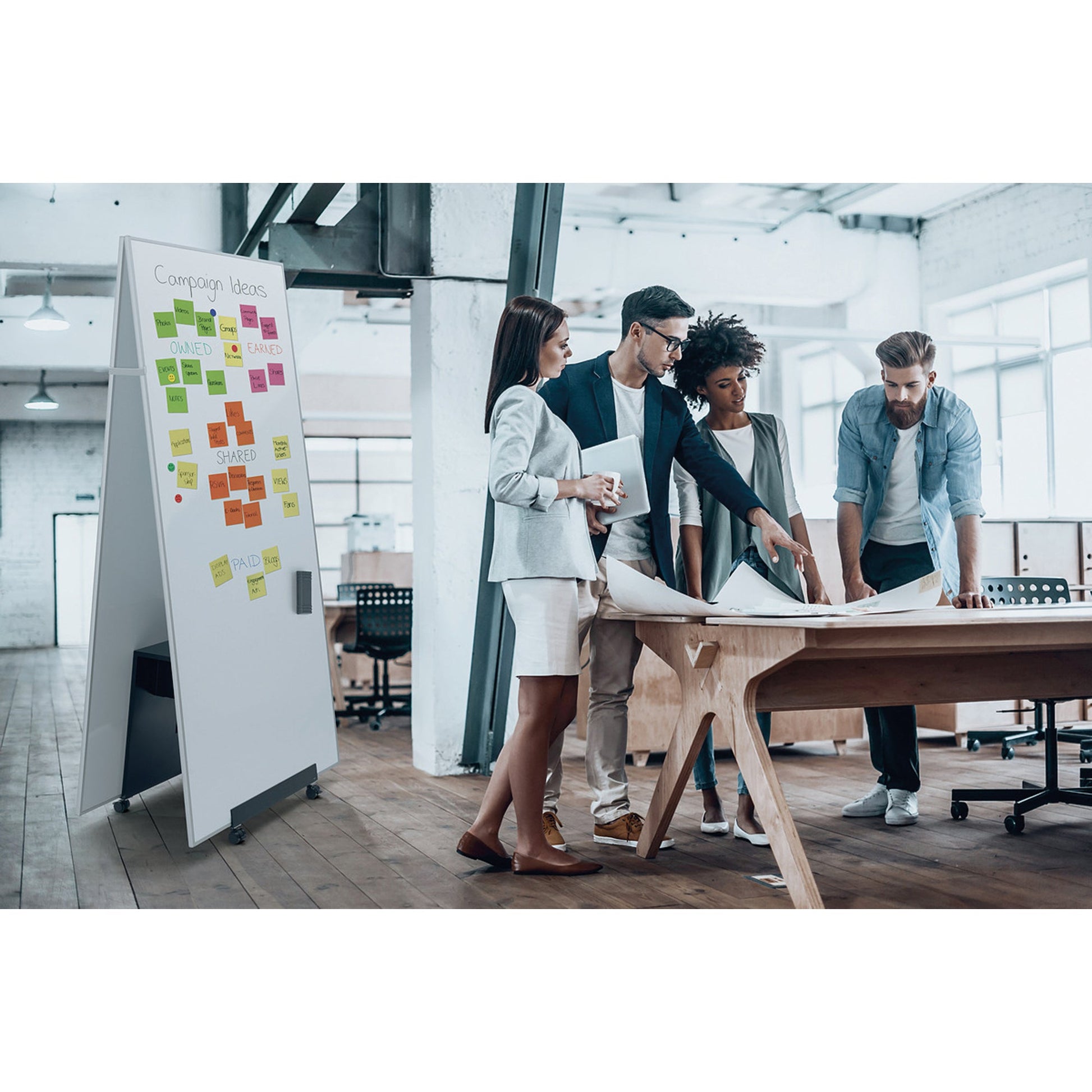 schwarzMit Meet up wird Projekt- und Teamarbeit transparenter, flexibler und effizienter. Dieser mobile Aufsteller ermöglicht optimales Arbeiten mit den agilen White- und Pinboards von SIGEL. Multifunktional nutzbar entweder mit einem Board mittig eingesteckt in den Schlitz oder mit zwei Boards im Tent-use. Das ist die komfortable Lösung für spontane und unkomplizierte Meetings oder Workshops ohne festen Besprechungsraum - und besonders vielseitig in der Anwendung im Kontext von agilen und kreativen Arbeitsweisen, z.B. Brainstormings, Scrum, Kanban oder Design Thinking. Der Stand dient gleichzeitig als Ablagemöglichkeit für Zubehör. Seine arretierbaren Rollen eignen sich bestens für harte Bodenbeläge. Für weiche Bodenbeläge gibt es größere Rollen zum Nachbestellen (4 ST; MU051). Zudem lassen sich bis zu drei Aufsteller aufeinander stapeln. Im Meet up Sortiment gibt es noch viele weitere, tolle Zubehörprodukte und Verbrauchsmaterialien, die das kreative und agile Arbeiten unterstützen wie etwa Moderationskarten, Static Notes, Klebepunkte, Marker, Pinnnadeln, Magnete, Oberflächen-Reinigungsprodukte, Divider Lanes u. v. m. (einzeln aber auch als Sets in bestückten Toolboxen). Meet up ist das Board-Komplettsystem für agiles und kreatives Arbeiten. Ideas to go. Anywhere. Anytime.