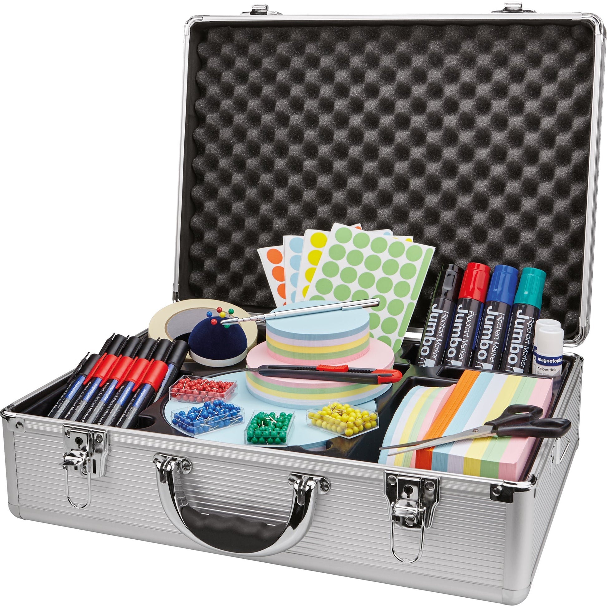 silberInhalt: 500 Kommunikationskarten, rechteckig 200 x 100 mm farbig sortiert, 200 Kommunikationskarten, Ø 100 mm farbig sortiert, 150 Kommunikationskarten, Ø 140 mm farbig sortiert, 150 Kommunikationskarten, Ø 190 mm farbig sortiert, 200 Kommunikationskarten, 190 mm x 110 mm, oval farbig sortiert, 10 Board- und Flipchart-Marker (6 x schwarz, 4 x rot), 4 Boardmarker Jumbo (1 x rot, 1 x grün, 1x blau, 1 x schwarz), 400 Pinnnadeln, 1 Teleskop-Zeigestab, 2 Klebestifte, je 20 g, 1 Papierschere 6 Zoll, 1 Cutter Klingenbreite 9 mm, 1 Klebefilmabroller mit 1 Klebefilmrolle 25 m x 19 mm, 1 Klebeband Krepprolle 50 m x 30 mm, 1200 Markierungspunkte (300 x gelb, 300 x blau, 300 x grün, 300 x rot), 1 Nadelkissen.