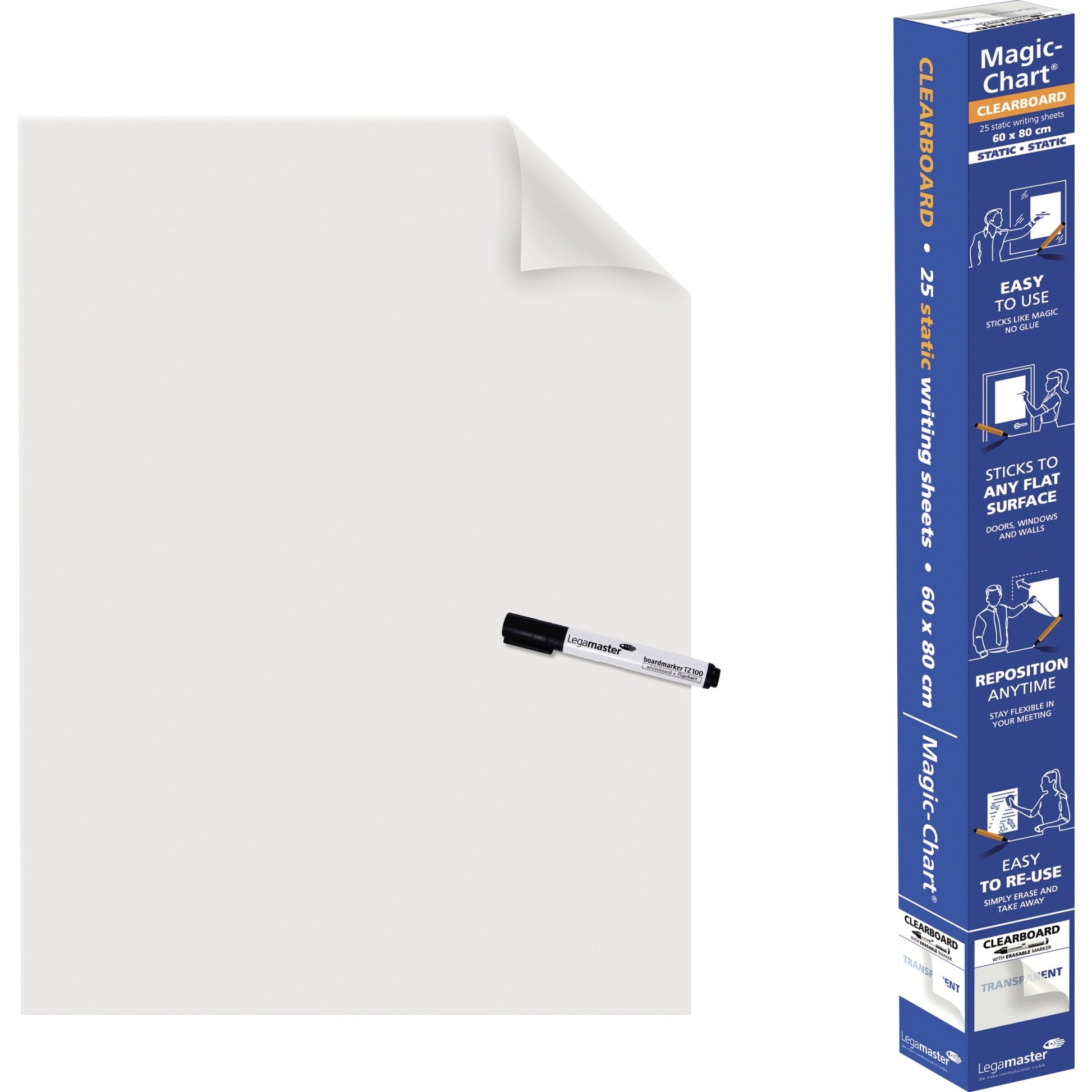 Bezeichnung: Legamaster Flipchartfolie Magic-Chart Clearboard 60 x 80 cm (B x H) 50µm selbsthaftend inkl. 1 Marker Polypropylen transparent 25 Bl./Pack.