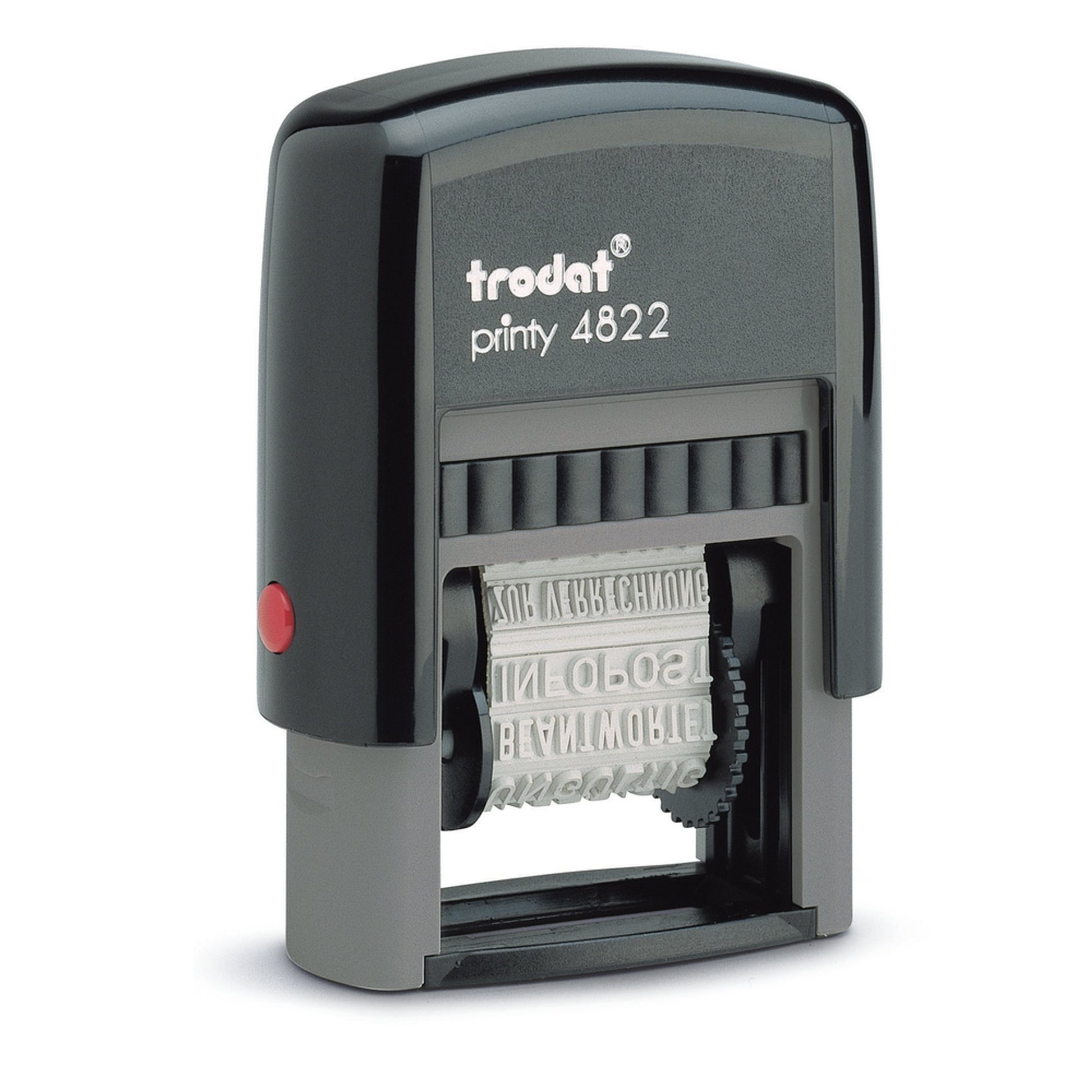 Bezeichnung: trodat® Wortbandstempel PrintyT 4822 schwarz BETRAG ERHALTEN, DRINGEND, GEBUCHT, KOPIE, UNGÜLTIG, ERLEDIGT, BEZAHLT, ZUR VERRECHNUNG, DRUCKSACHE, BEANTWORTET, PÄCKCHEN, EINSCHREIBEN Kunststoff schwarz