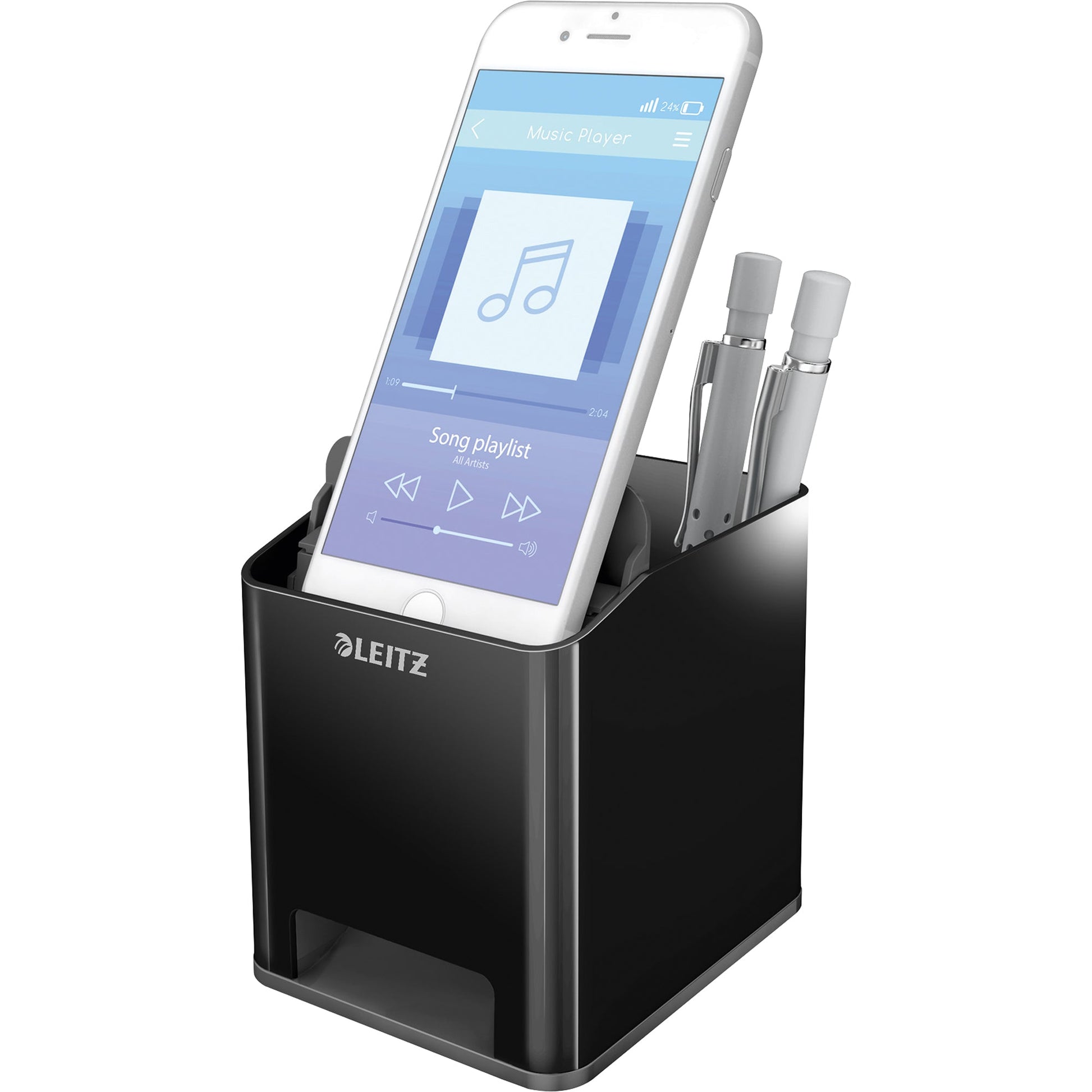 schwarz/grauSound Stifteköcher in modernem zweifarbigem Duo Colour Effekt und Premium-Qualität. Viel Platz für Schreibgeräte, Lineal, Stylus und mehr. Extra Fach für das Smartphone (bis iPhone 6 Plus). Smartphone fach mit Soundverstärkungsfunktion, die das Klangvolumen des Smartphones erhöht. Verstärkt den Sound bis zu 100 %. Smartphone Bildschirm bleibt vollständig sichtbar. Die Fächerunterteilungen gewährleistet einen aufrechten Stand des Inhalts.
