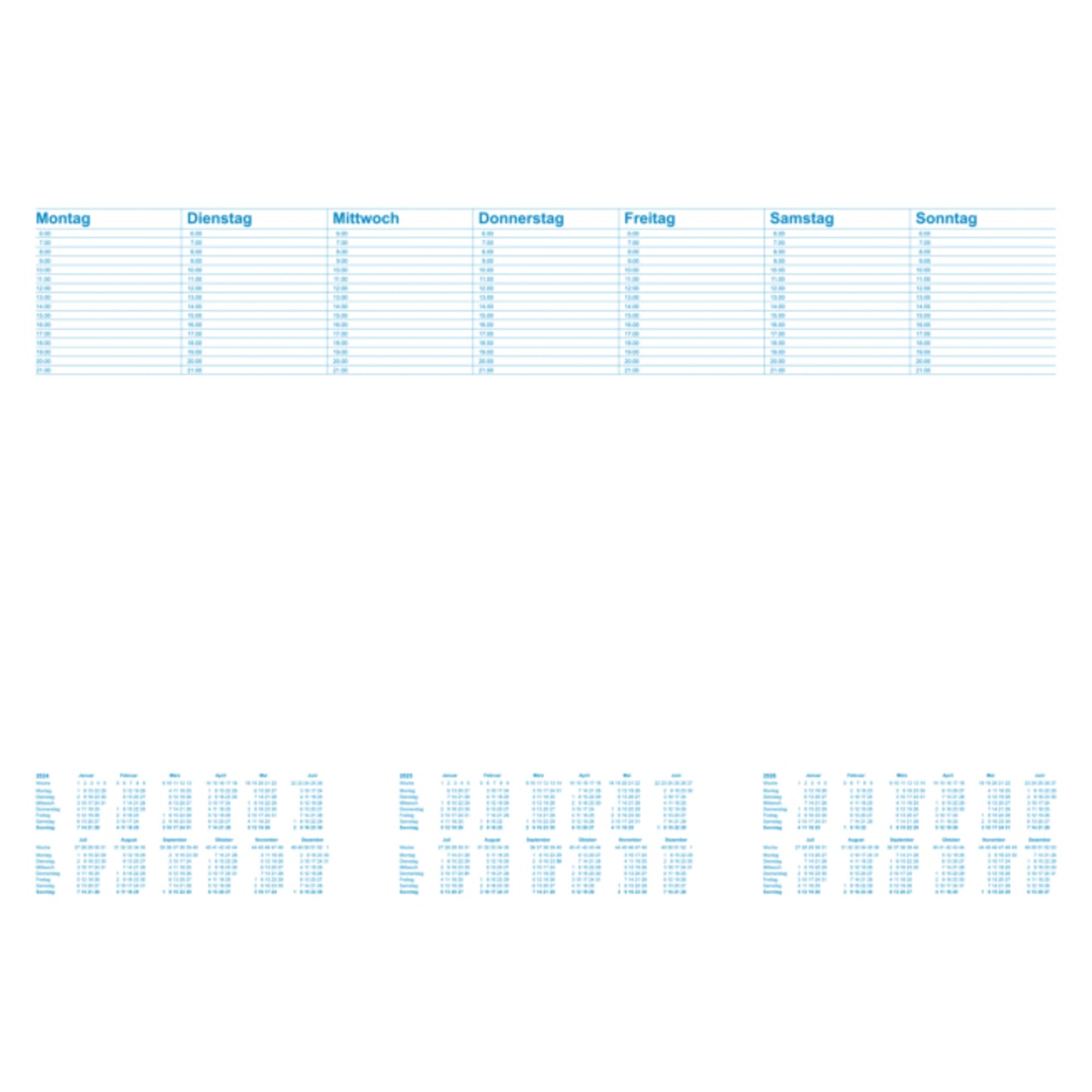 weiß/blauAuf der Notiz Schreibunterlage aus Papier mit Kartonunterlage ist viel Platz für Notizen aller Art. Es stehen 7 Wochentagsfelder und ein großes allgemeines Notizfeld zur Verfügung. Mit Stundeneinteilung pro Wochentag.