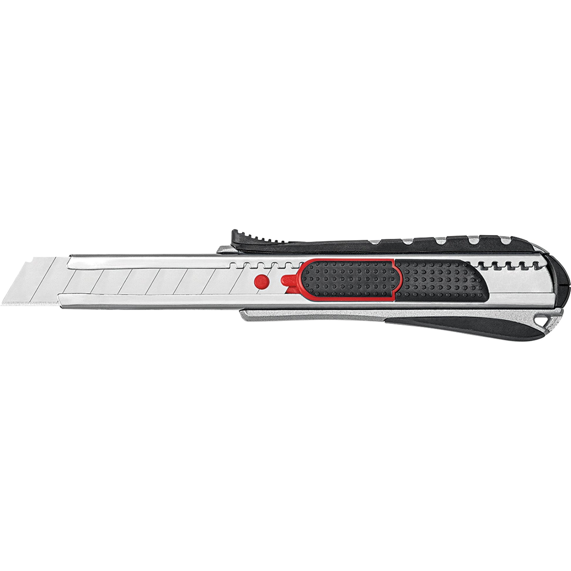 schwarz/rotIn diesen neuartigen Cuttern sind die Funktionen des klassischen Cutters mit Standard-Abbrechklingen und des Safety-Cutters mit automatischem Klingenrückzug in einem Gerät kombiniert. Die federbelastete Klinge sorgt für mehr Sicherheit beim Schneiden, da sie sich automatisch zurückzieht, wenn das Messer vom Schneidegut abrutscht. Die Klinge kann jedoch auch konventionell mittels Rasterautomatik vorgeschoben werden.