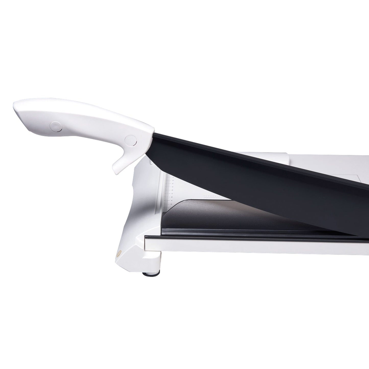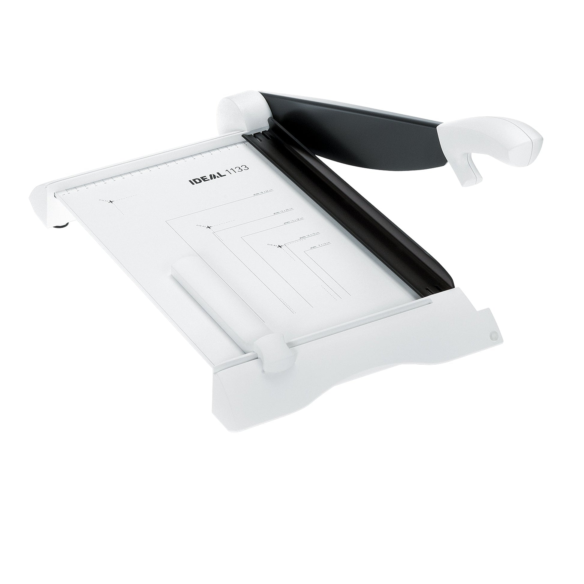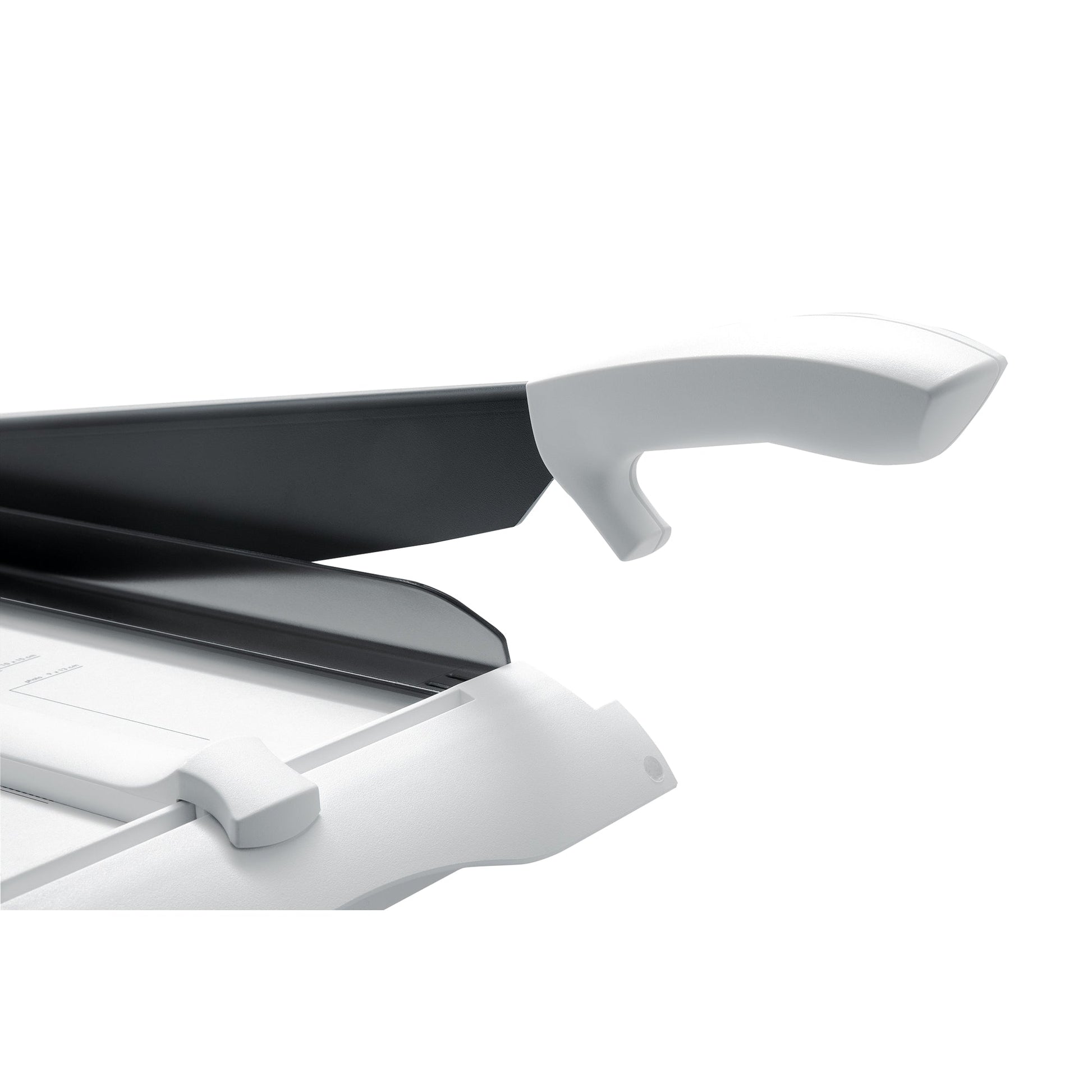 weißAttraktiver Hebelschneider - ideal auch für Fotoausdrucke vom PC. Lasergeschnittenes Universalmesser und Schnittschiene aus hochwertigem Spezialstahl mit Antihaftbeschichtung. Transparente Anpressschiene mit Übergriffschutz und integriertem Präzisions-Schnittandeuter. Stufenlos verstellbarer Rückanschlag. Papierformate von DIN A4 bis DIN A6 und gängige Fotoformate auf dem Schneidetisch. Zwei Papieranlagen. Rückanschlag (kann auf vorderer oder hinterer Papieranlage platziert werden).