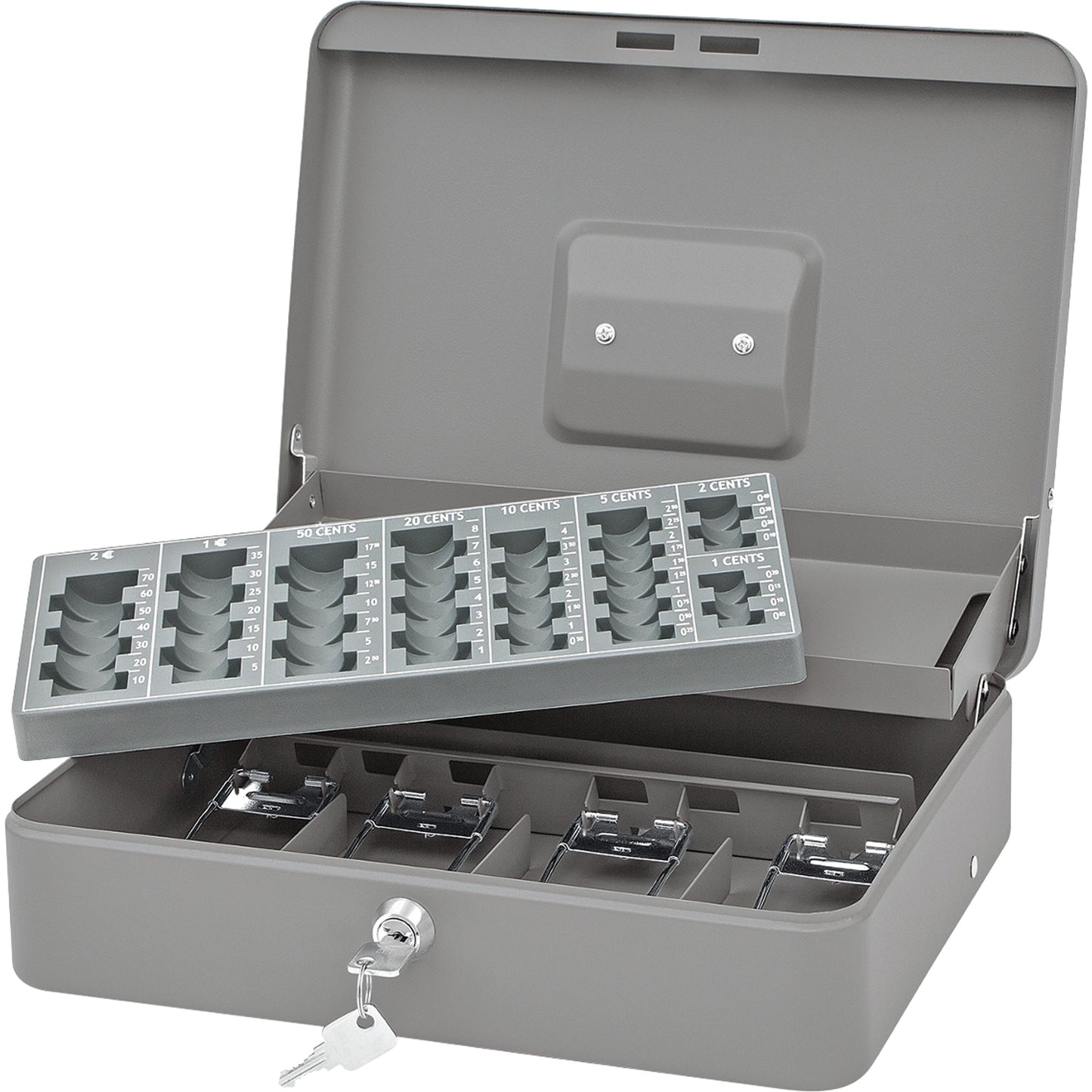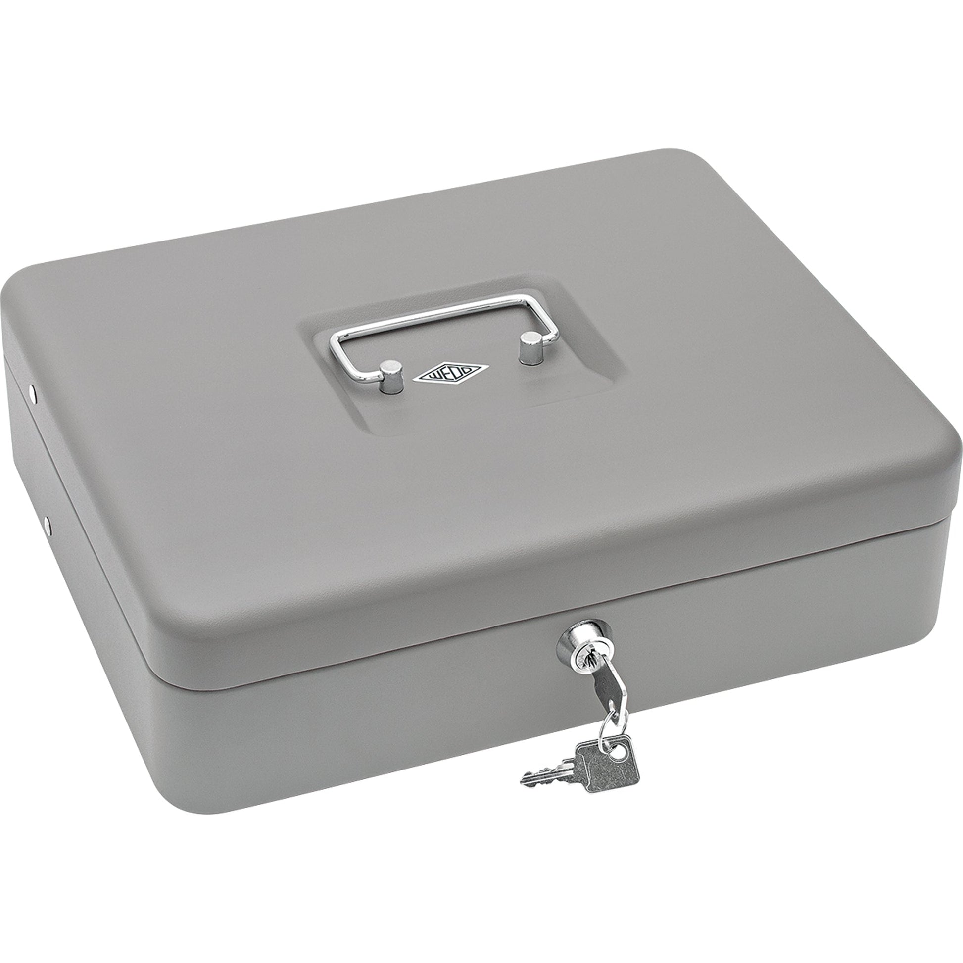 Bezeichnung: WEDO® Geldkassette Standard PLUS 30 x 9 x 24 cm (B x H x T) 4 Fächer für Banknoten 8 Fächer für Hartgeld mit Schloss Stahlblech, pulverbeschichtet grau