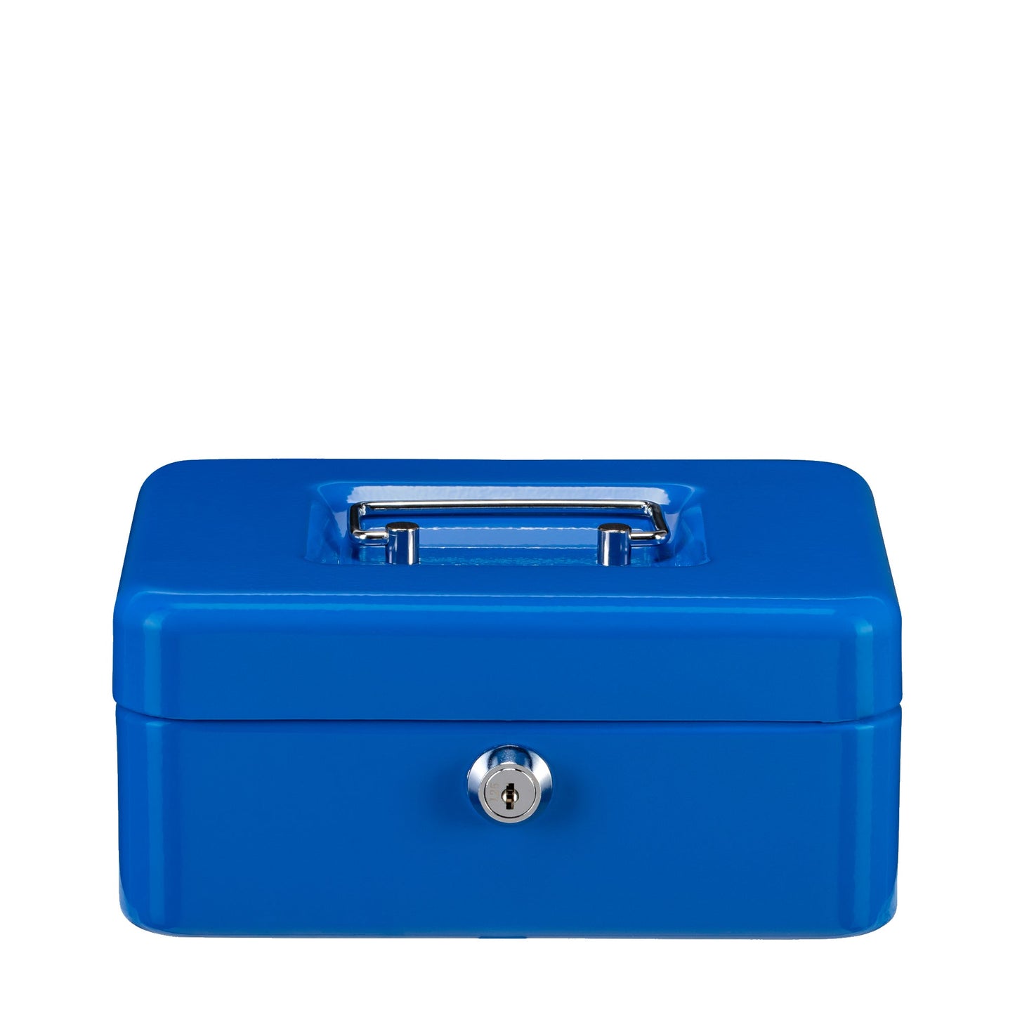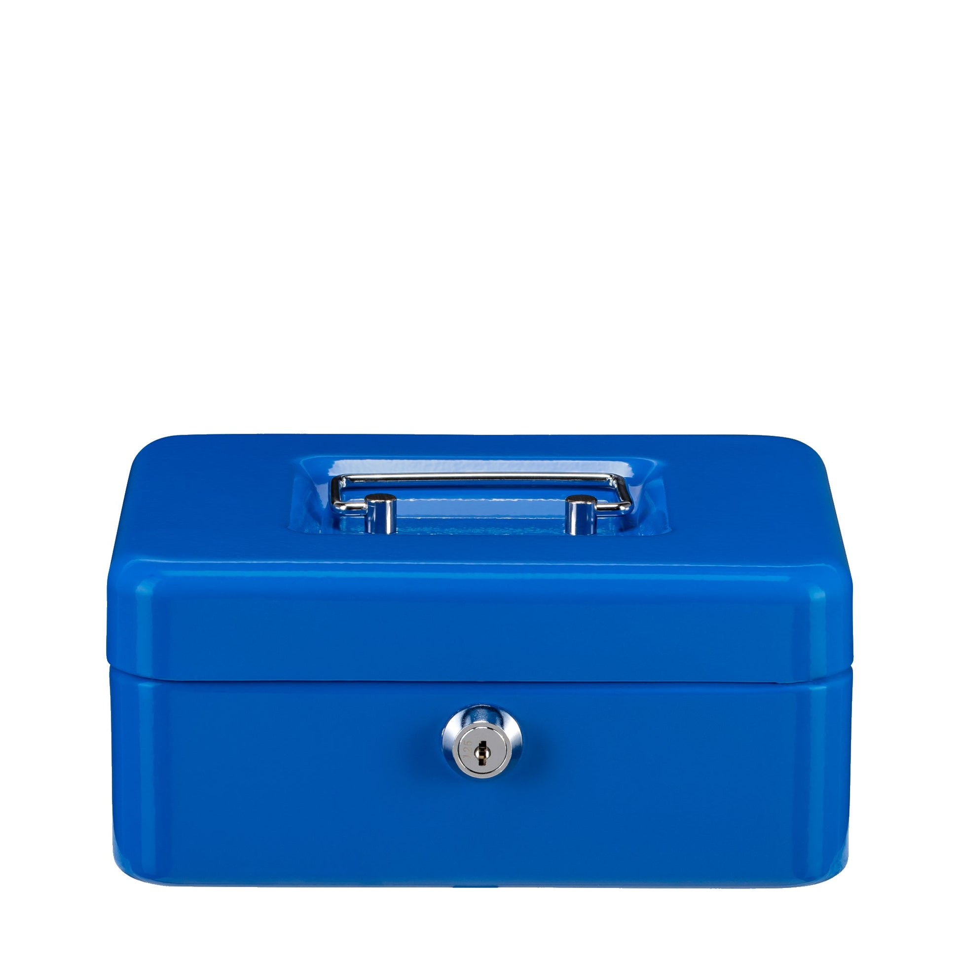 blauGeldkassette zum Verschließen von Bargeld, Schmuck, wichtigen Papieren oder anderen Wertsachen. Der Griff liegt im Deckel der Geldkassette ein, sodass sie gut in Schränken oder Schubladen verstaut werden kann. In dem innenliegenden Einsatz können die Wertsachen übersichtlich sortiert werden.