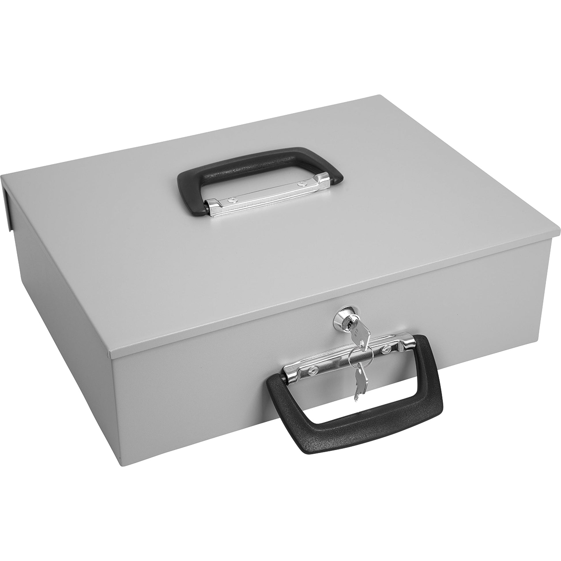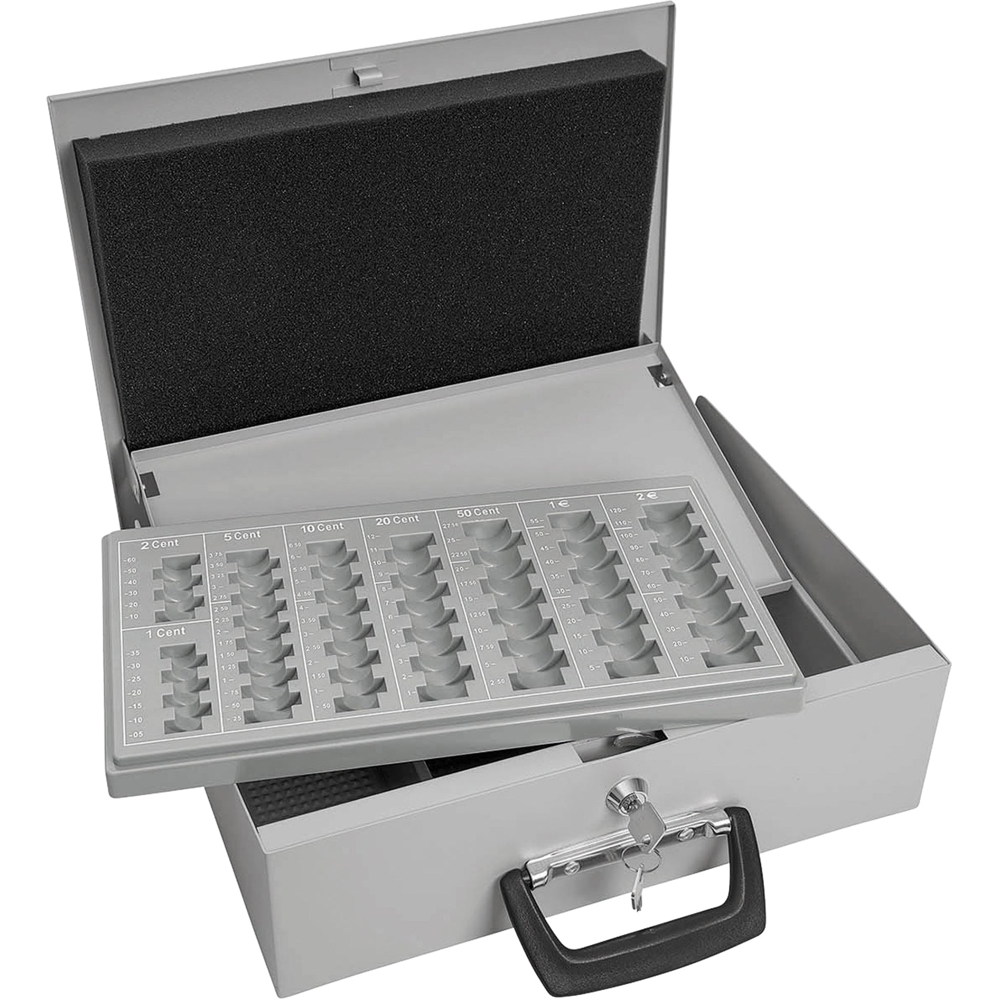 Bezeichnung: WEDO® Geldkassette Universa 35,5 x 10 x 27,5 cm (B x H x T) 4 Fächer für Banknoten 8 Fächer für Hartgeld mit Schloss Stahl, pulverbeschichtet lichtgrau