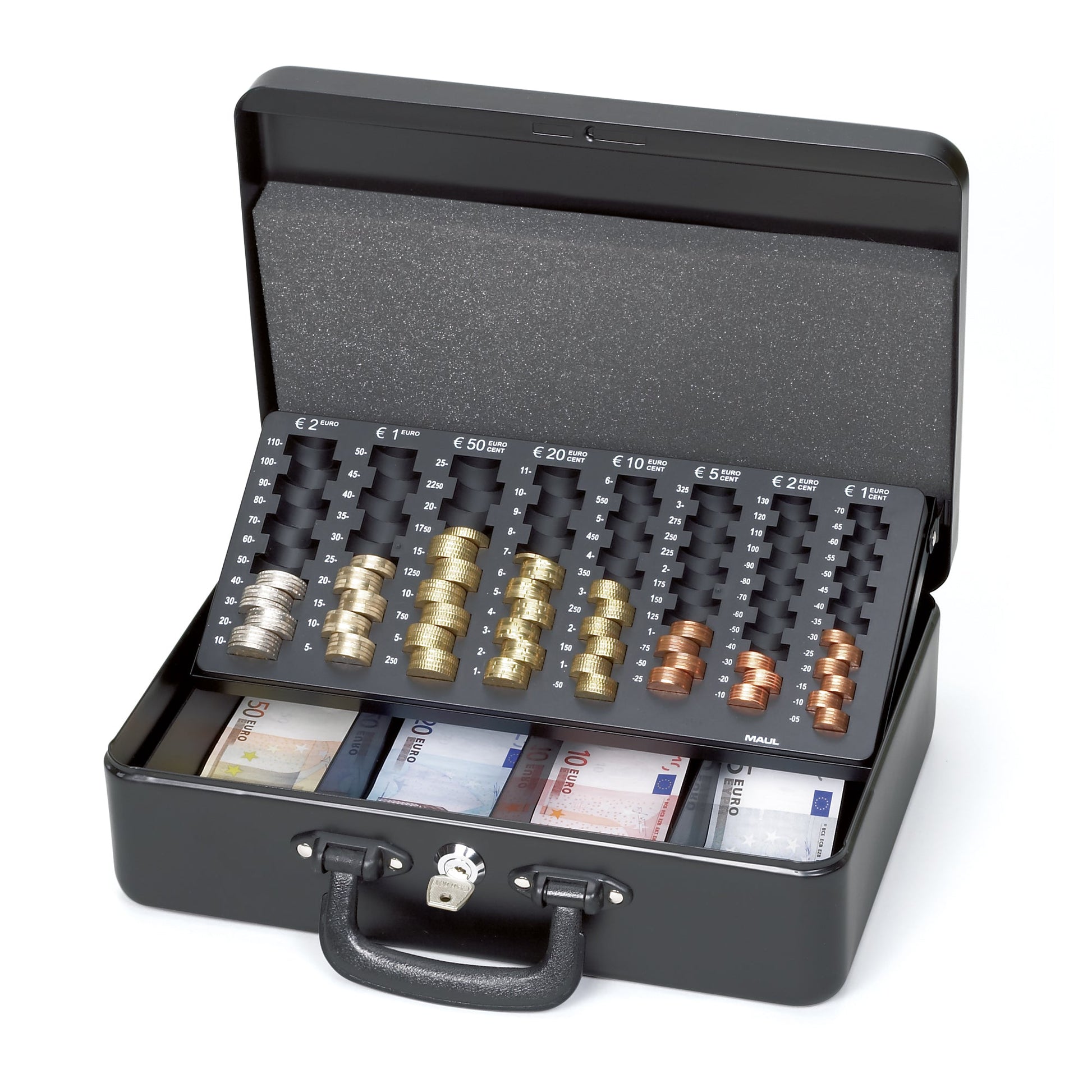 Bezeichnung: MAUL Geldkassette 36 x 11,2 x 26,5 cm (B x H x T) 4 Fächer für Banknoten 8 Fächer für Hartgeld mit Schloss Stahl schwarz