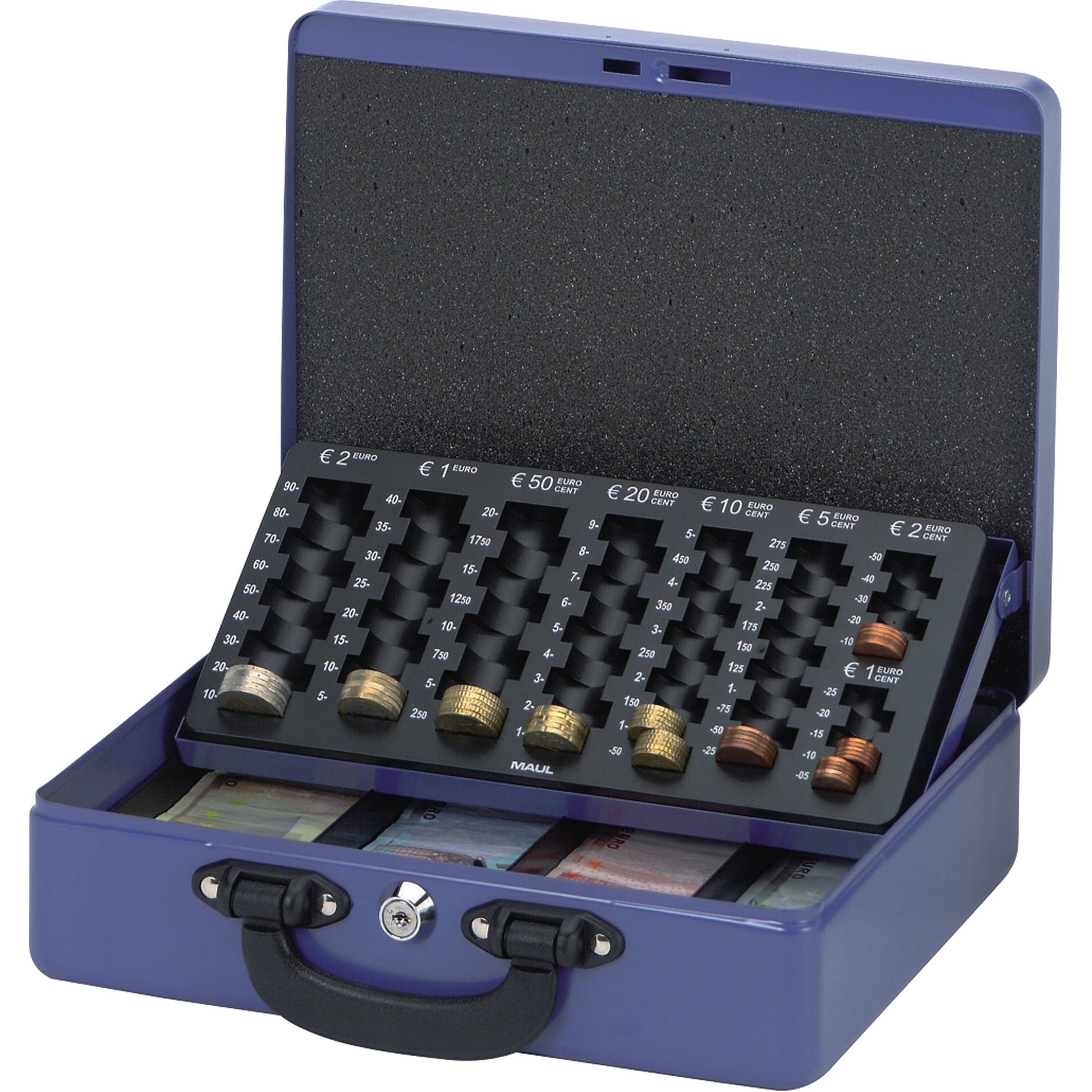 Bezeichnung: MAUL Geldkassette 30 x 9,3 x 24,5 cm (B x H x T) 4 Fächer für Banknoten 8 Fächer für Hartgeld mit Schloss Stahl blau