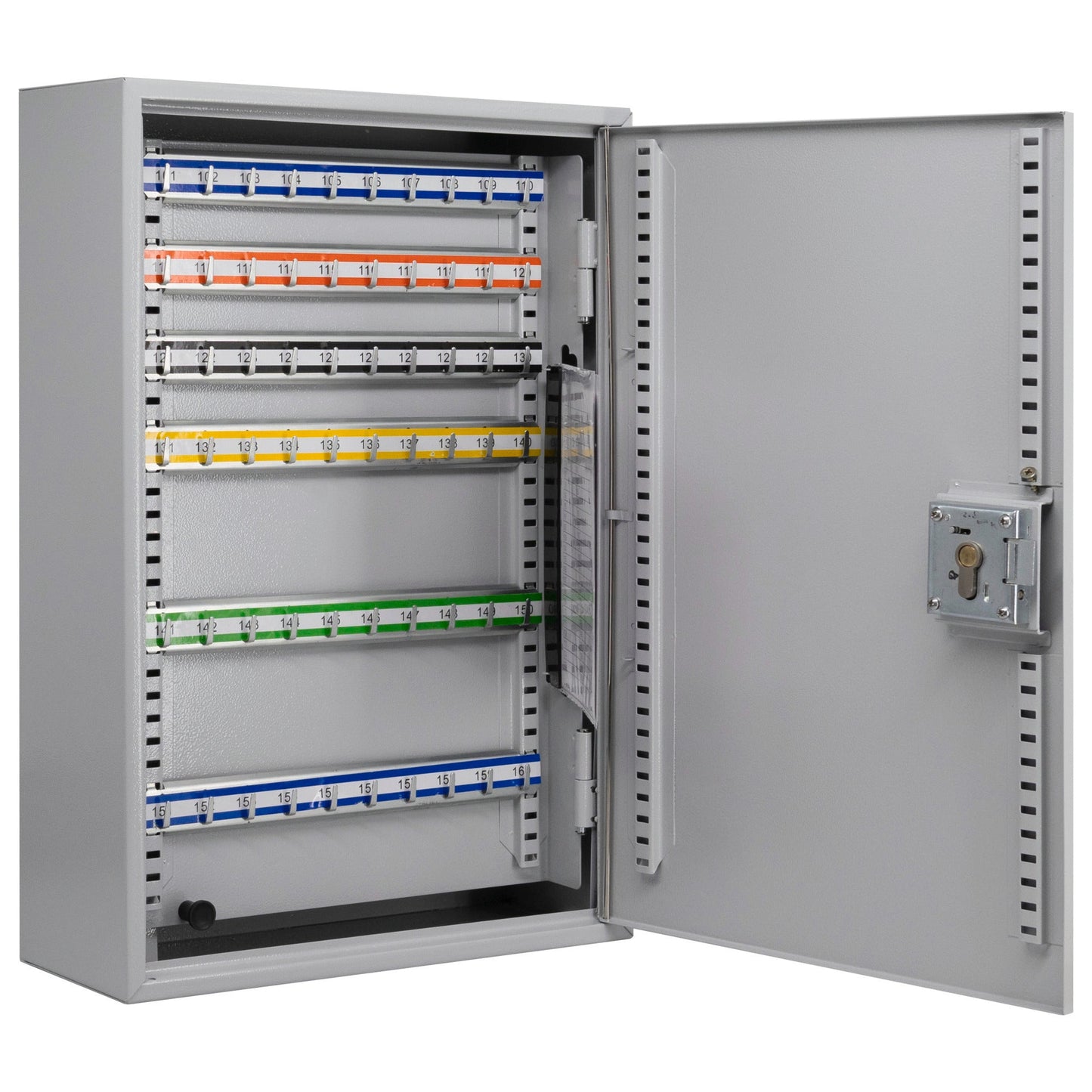 hellgrauHochwertig. Übersichtliche Schlüsselaufbewahrung. Farbige, variable Hakenleisten. Schlüsselregister herausnehmbar. Profilzylinder 30/10. Profilzylinder steht etwas vor. Mit einer zusätzlichen, schwenkbaren Innentafel.