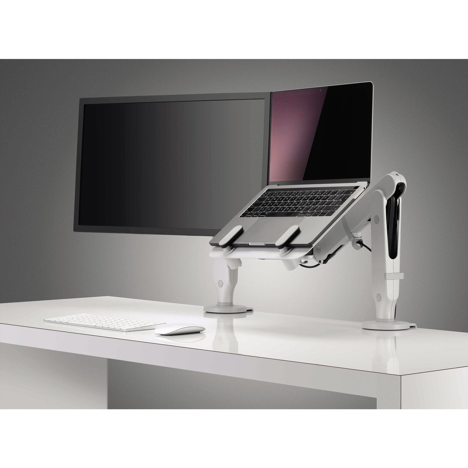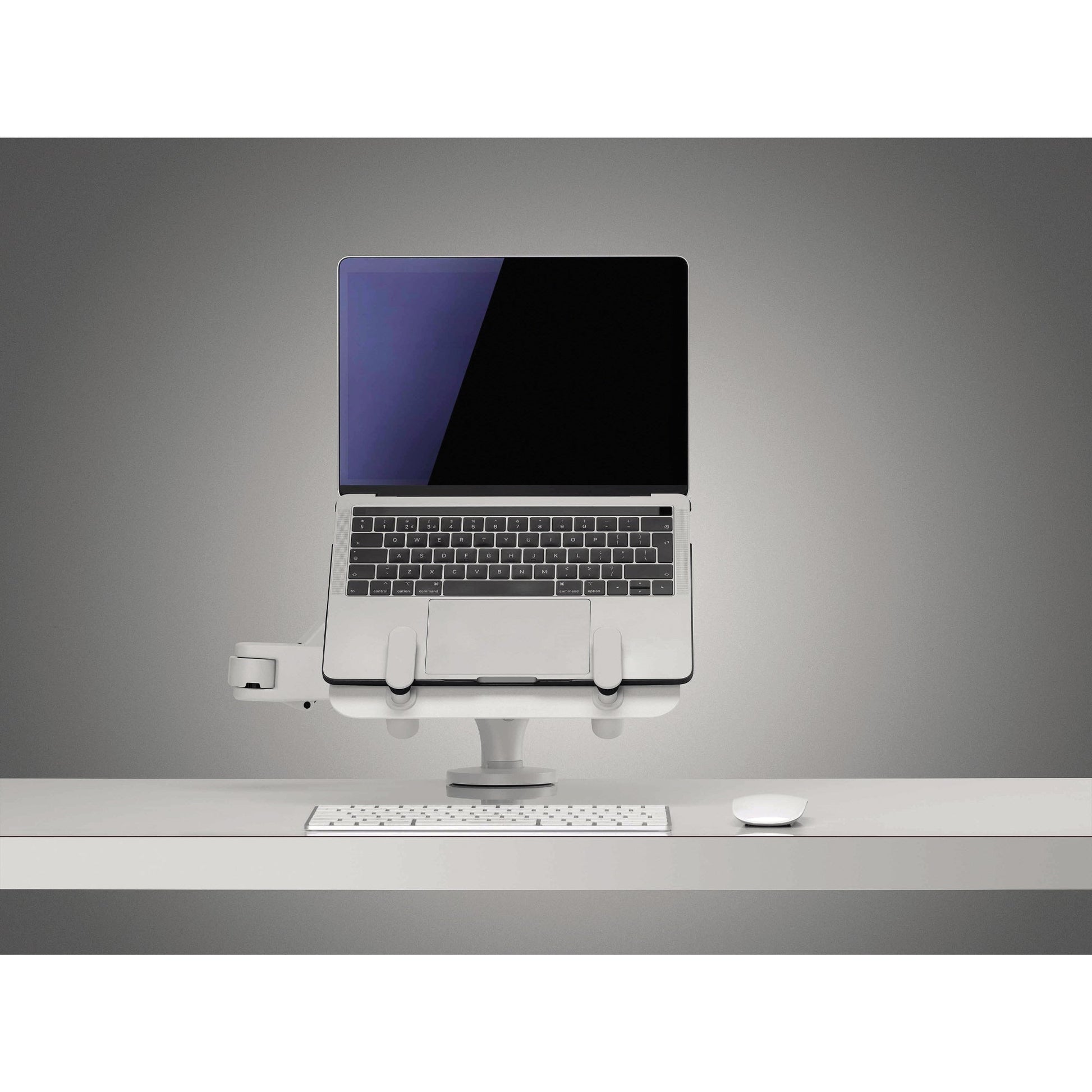 weißDie Ollin Laptop- und Tablet-Halterung kann nahtlos in Ollin Monitorarme integriert werden. Mit der innovativen Klemmvorrichtung können Laptops und Tablets im Quer- oder Hochformat fixiert werden. Mit dieser praktischen Halterung kann der Bildschirm auf Augenhöhe eingestellt werden, um die Sitzhaltung des Nutzers zu verbessern und mehr Platz auf dem Schreibtisch zu schaffen. Ganz gleich, ob zuhause oder im Büro – die Ollin Laptop- und Tablet-Halterung fördert eine gute Körperhaltung und verbessert die Ergonomie am Arbeitsplatz. Die Ollin Laptop- und Tablet-Halterung kann in Verbindung mit einer separaten und Maus und Tastatur genutzt werden, mindert Augen-, Nacken- und Rückenbelastung und sorgt für mehr Komfort bei längerem Sitzen. Ein pulverbeschichteter eleganter Fuß aus Stahl, ein dünnes Profil, gerundete Kanten und eine hochwertige Oberfläche machen die Ollin Laptop- und Tablet-Halterung zu einer stilvollen Ergänzung an jedem Arbeitsplatz. Und die integrierten Kabelmanagementkanäle sorgen für hervorragende Optik auf dem Tisch und helfen dabei, ihn ordentlich und sauber zu halten.