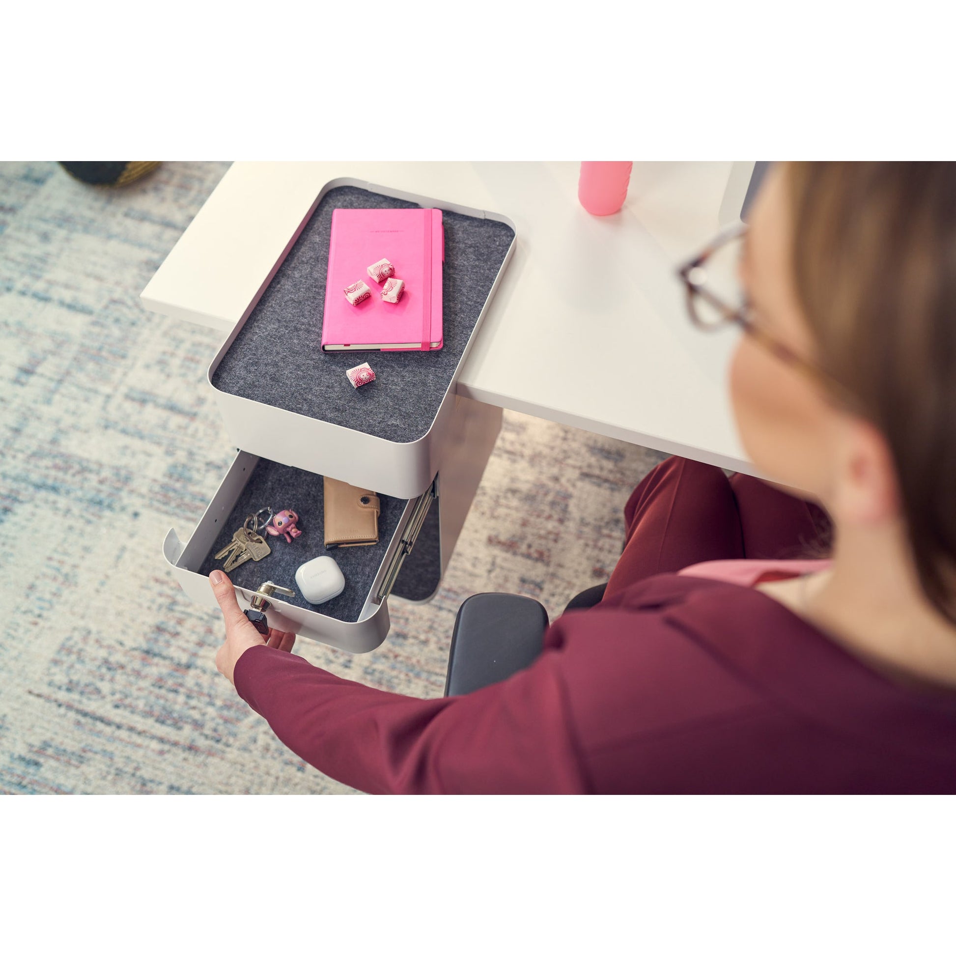 weißDer innovative Bento®-Desktoplocker ist der zeitgemäße Nachfolger des klassischen Rollcontainers, der für Activity Based Work-Umgebungen und modernes Arbeiten neu gestaltet wurde. Bewahren Sie Ihre Sachen in diesem schön gestalteten persönlichen Schrank auf, der sich mit Ihrem Sitz-/Steharbeitsplatz mitbewegt. Alles ist griffbereit und wenn Sie nicht an Ihrem Schreibtisch sitzen, sind Ihre Sachen in der abschließbaren Soft-Close-Schublade sicher verstaut. Der Kleiderhaken sorgt dafür, dass Ihr Rucksack oder Ihre Tasche nicht auf dem Boden stehen. Weiche Einlagen aus PET-Filz schützen ihre Utensilien.