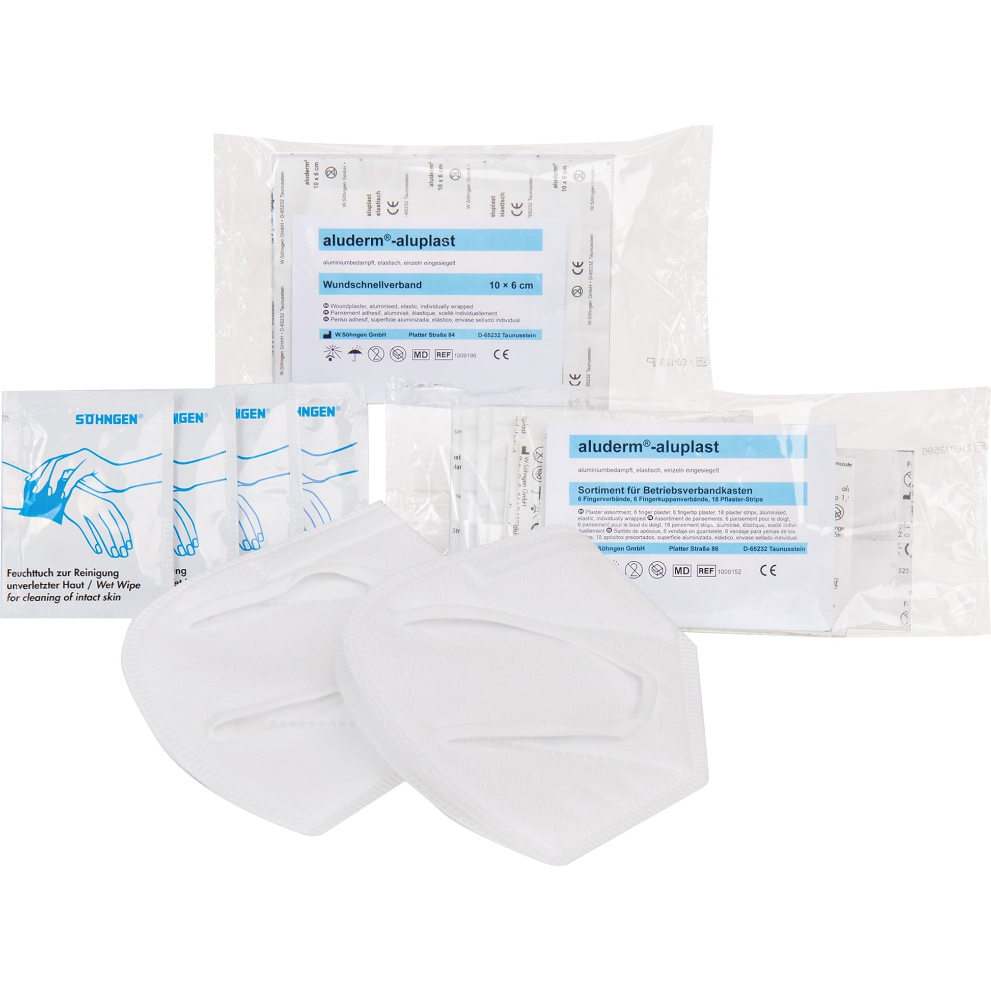 Inhalt: 1 aluderm®-aluplast Sortiment klein, 1 aluderm®-aluplast elastisch VBK-Set 12 Stück à 10 × 6 cm, 4 Feuchttücher zur Reinigung unverletzter Haut, 2 FFP2-Masken.