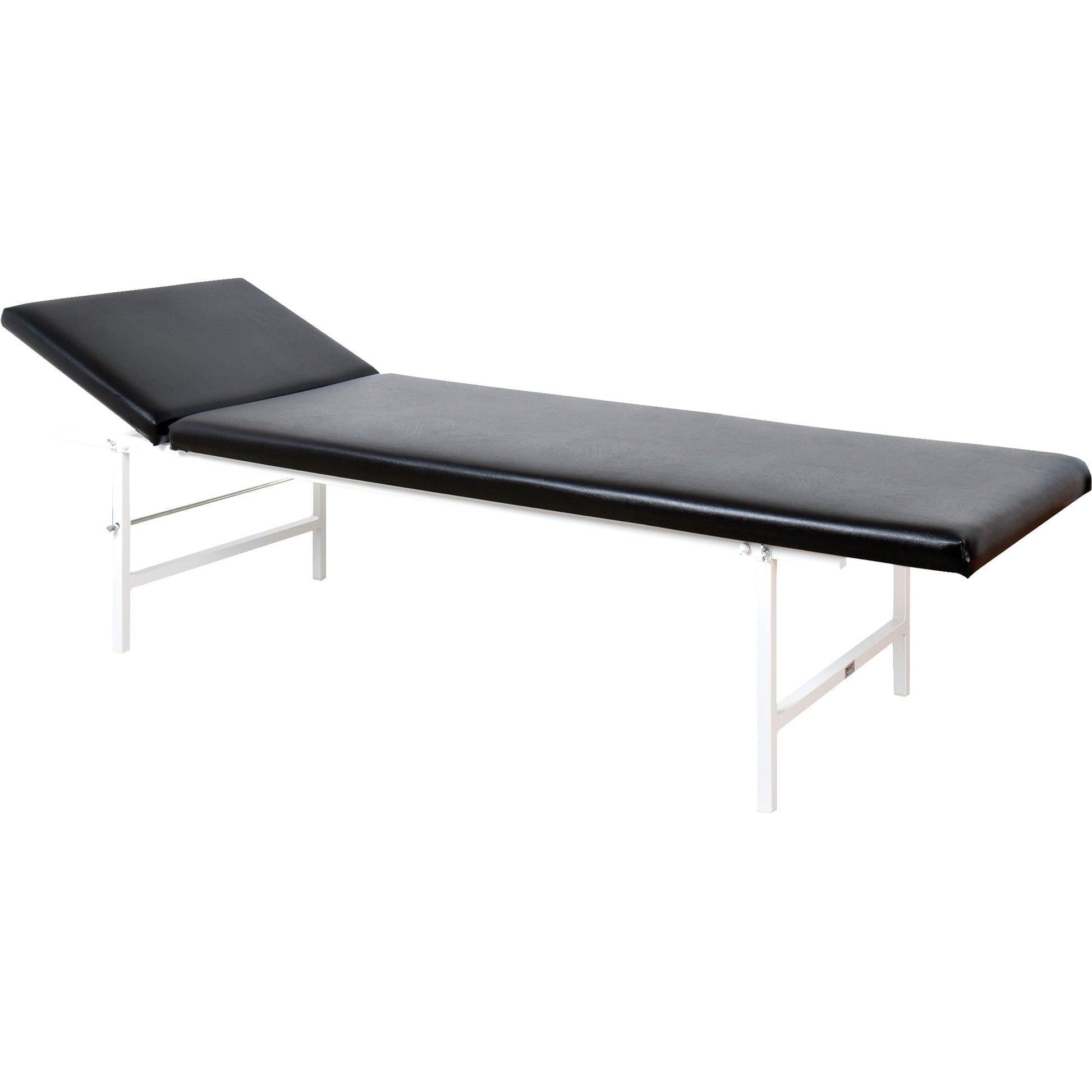 schwarzMit Belüftungsbohrungen, hochbelastbar, formaldehydfrei. Polster aus Qualitäts-Schaumstoff, ca. 40 mm stark. Polsterbezug gewebeverstärktes Kunstleder, strapazierfähig, pflegeleicht, schmutzabweisend, Bezug schwarz. Mehrstufig verstellbares Kopfteil. Rahmenkonstruktion aus Vierkantprofilen, stabil und belastbar, elektrostatisch weiß pulverbeschichtet. Integrierte Abrollvorrichtung für Ärztekrepp. Trägerplatte: ca. 2,2 cm.