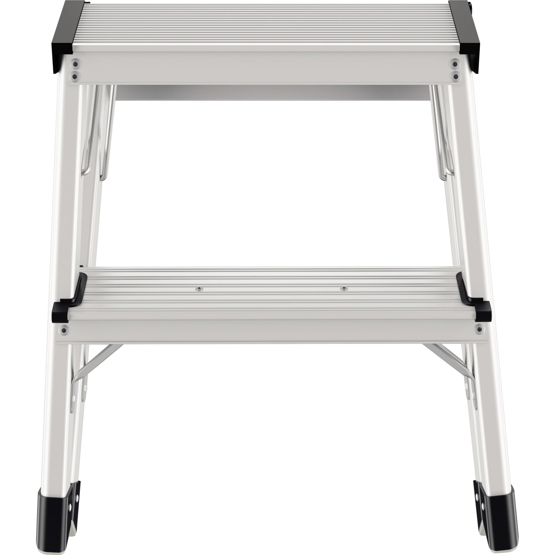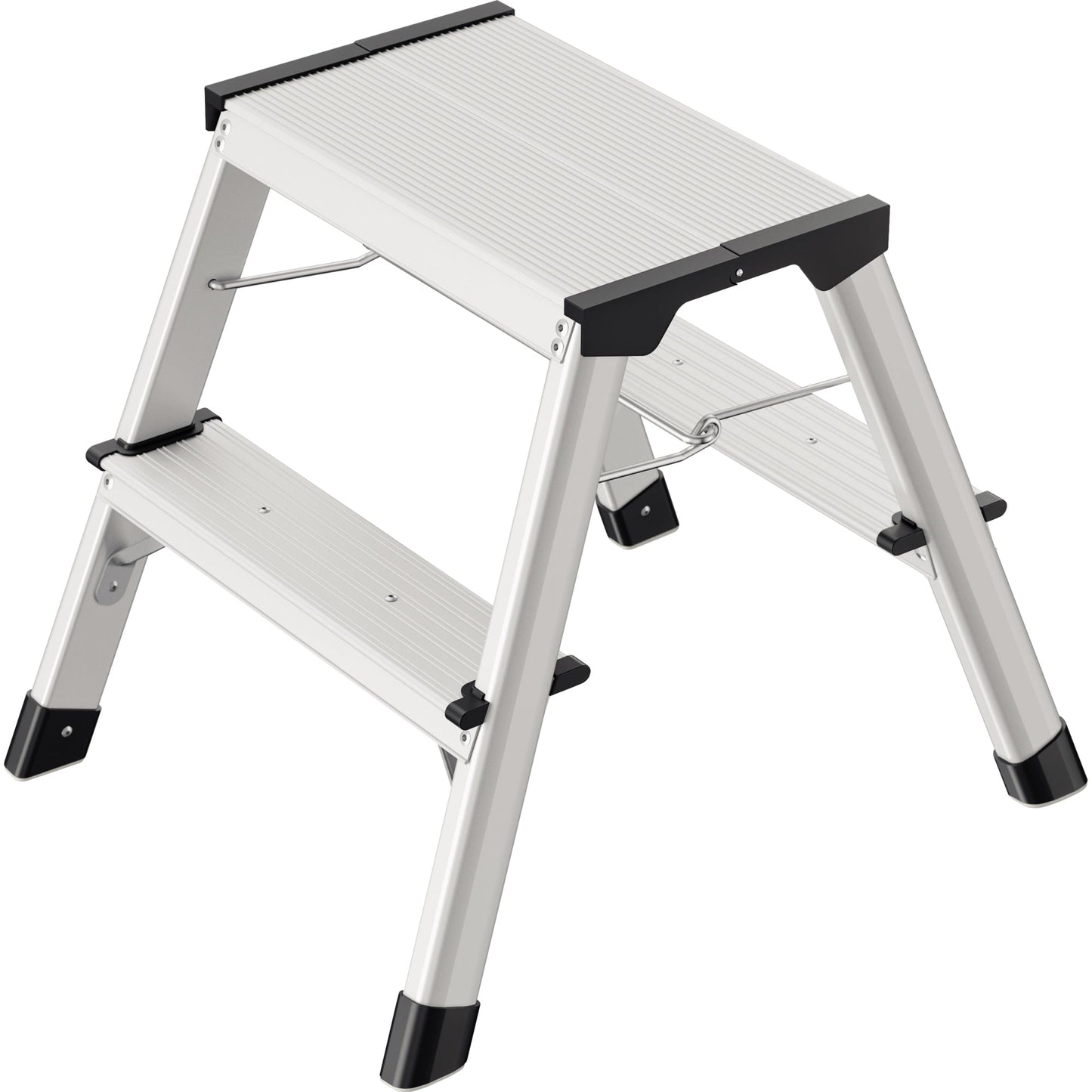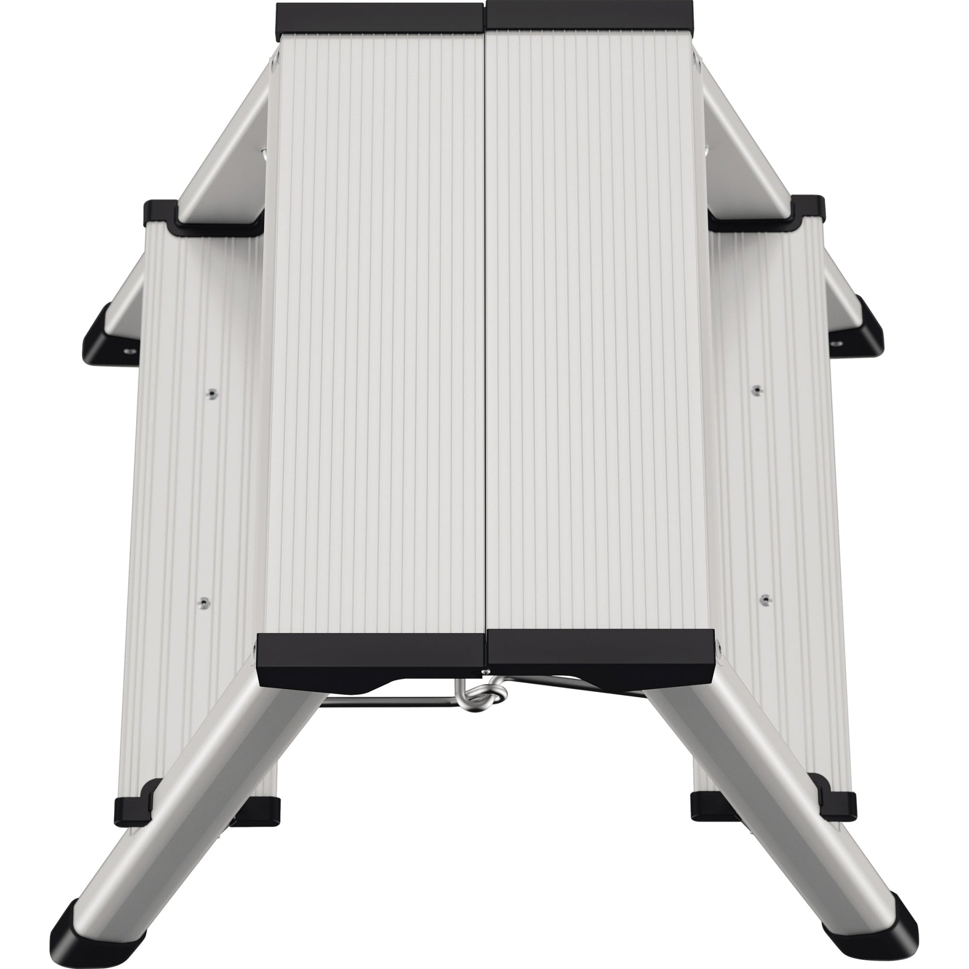 aluHailo D60 StandardLine. Die Alu-Trittleiter zum Steigen und Sitzen. Mit Klappsperre. Praktischer Doppelstufen-Klapptritt. Platzsparend zusammenklappbar. Fuß mit Soft-Grip-Sohle für optimale Stand- und Rutschsicherheit auf verschiedenen Fußböden, wie z.B. Parkett, Teppichböden und Fliesen. Breite und tiefe Stufen mit Spezial-Riffelung. Stufentiefe: 8,2 cm.