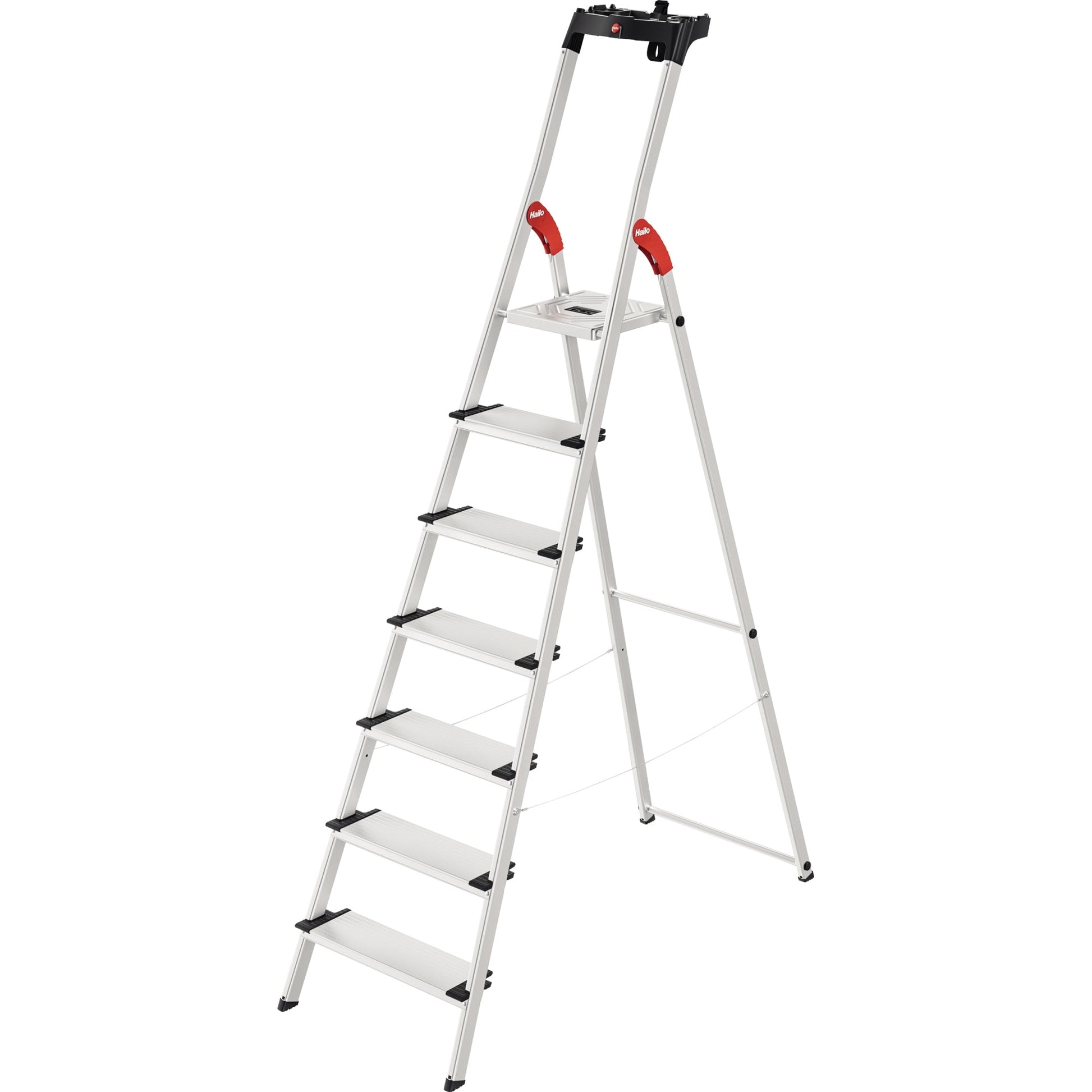 silberRutschsicherer Steckfuß. Multifunktions-Ablageschale zur Ablage von Werkzeugen, Farbdosen oder Kleinteilen. Eimerschlaufe mit Klick-Schnellverschluss zur sicheren Befestigung von Eimern, Staubsaugern oder Kabeltrommeln. Platzsparend zusammengeklappt durch Parkbucht in den Stufen. Geeignet für Hailo EasyClix Wechselfüße (optionales Zubehör). XXL-Alu-Stufen mit Anti-Rutsch-Riffelung und extra tiefer Standfläche. Verzinkte Stahl-Plattform mit Anti-Rutsch-Riffelung. Mehr Kniefreiheit durch parallele Holme. Sichere HighTech-vernietete Holm-Stufenverbindung. Für den privaten und gewerblichen Gebrauch geeignet.