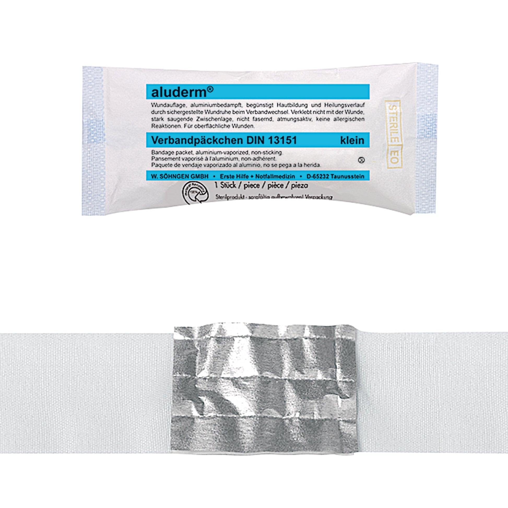 Bezeichnung: aluderm® Verband 6 cm x 3 m (B x L) Maße Kompresse: 8 x 6 cm (B x L) Polyestervlies, aluminiumbedampft