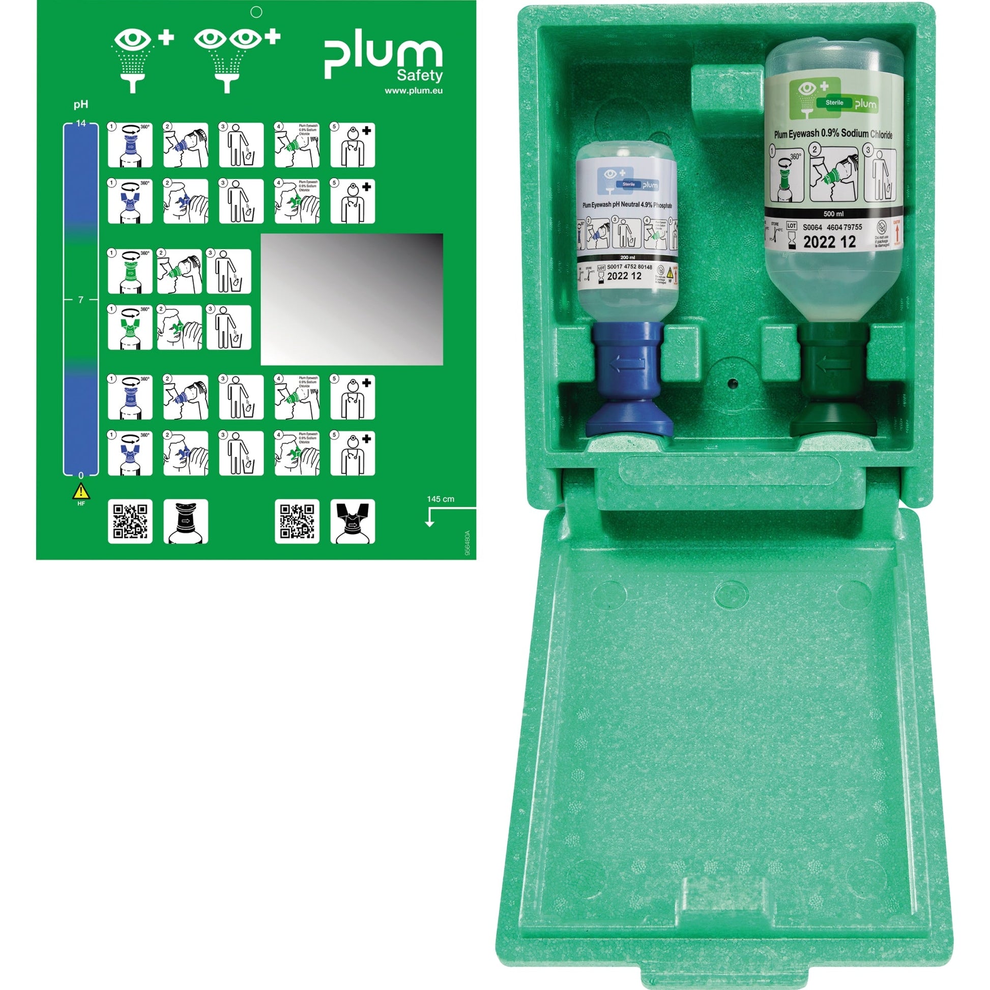 Bezeichnung: PLUM Augenspülstation 28 x 23 x 11 cm (B x H x T) 1 x 200 ml pH Neutral 4.9 % Phosphate, 1 x 500 ml 0,9 % Natrium Chloride Augenspüllösung, Piktogrammtafel mit Spiegel grün