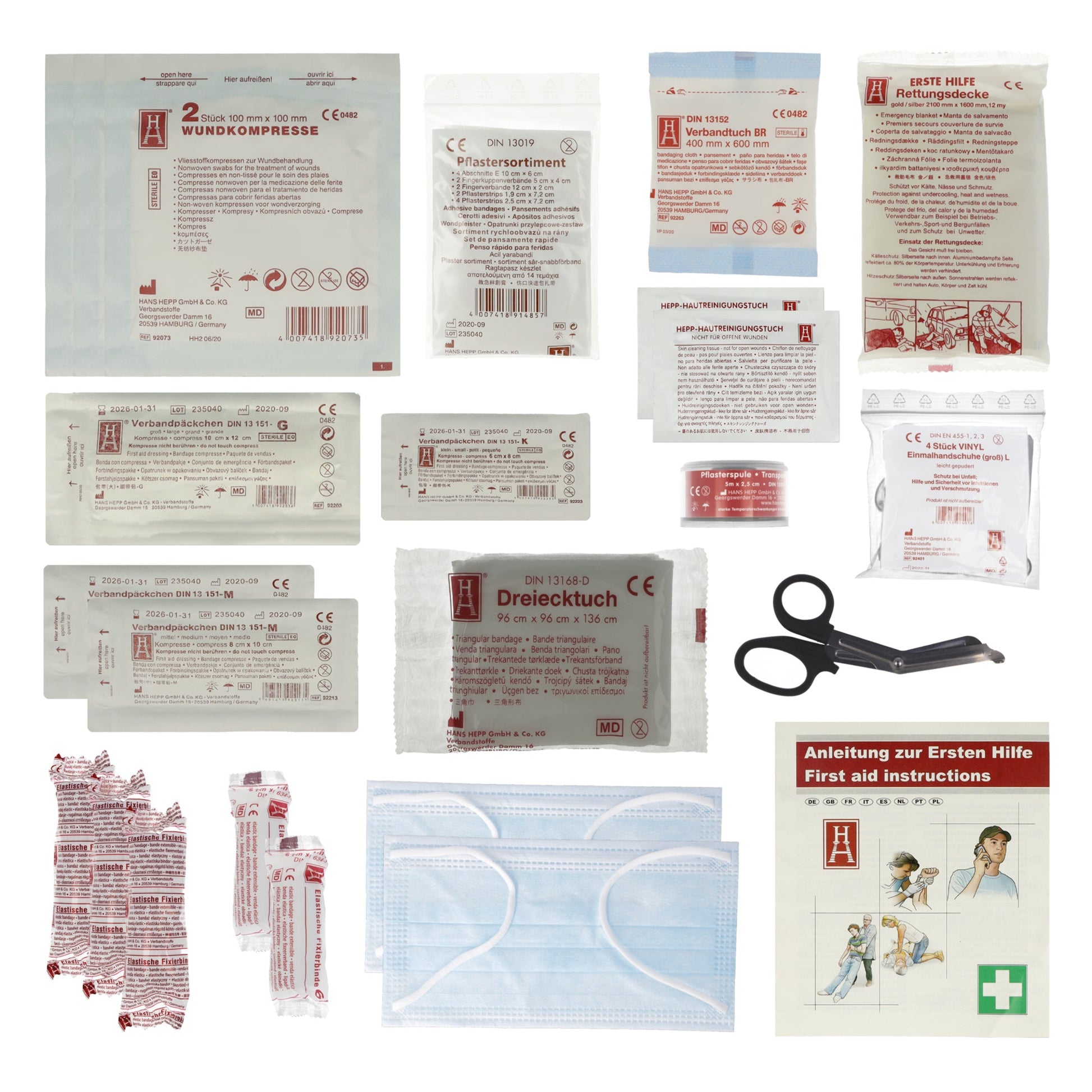 schwarzDieser Erste Hilfe Verbandkasten ist speziell für den Einsatz im KFZ konzipiert. Er ist formstabil, bruchfest und hitzebeständig und bietet zuverlässigen Schutz und Langlebigkeit. Der kompakte und leicht zu verstauende Kasten enthält alle notwendigen Materialien zur Erstversorgung bei Unfällen und Verletzungen unterwegs. Inhalt: 1 x Pflaster-Sortiment (14 Teile) DIN 13019 im Wiederverschlussbeutel (4 x Abschnitte 10 cm x 6 cm, 2 x Fingerkuppenverbände 5 cm x 4 cm, 2 x Fingerverbände 12 cm x 2 cm, 2 x Pflasterstrips 1,9 cm x 7,2 cm, 4 x Pflasterstrips 2,5 cm x 7,2 cm), 1 x Heftpflasterspule 5 m x 2,5 cm, 2 x Hautreinigungstücher, 1 x Verbandpäckchen DIN13151-K, 2 x Verbandpäckchen DIN 13151-M, 1 x Verbandpäckchen DIN 13151-G, 1 x Verbandtuch DIN 13152-A, 3 x Kompresse 100 x 100 mm, 2 x Fixierbinde DIN 61634-FB6, 3 x Fixierbinde DIN 61634-FB8, 2 x Dreiecktuch DIN 13168-D, 1 x Schere DIN 58279-A145, 1 x Rettungsdecke gold/silber, 2 x Gesichtsmasken Typ 1 DIN EN 14683, 4 x Medizinische Handschuhe zum einmaligen Gebrauch nach DIN EN 455, 1 x Anleitung zur ersten Hilfe, 1 x Inhaltsverzeichnis.