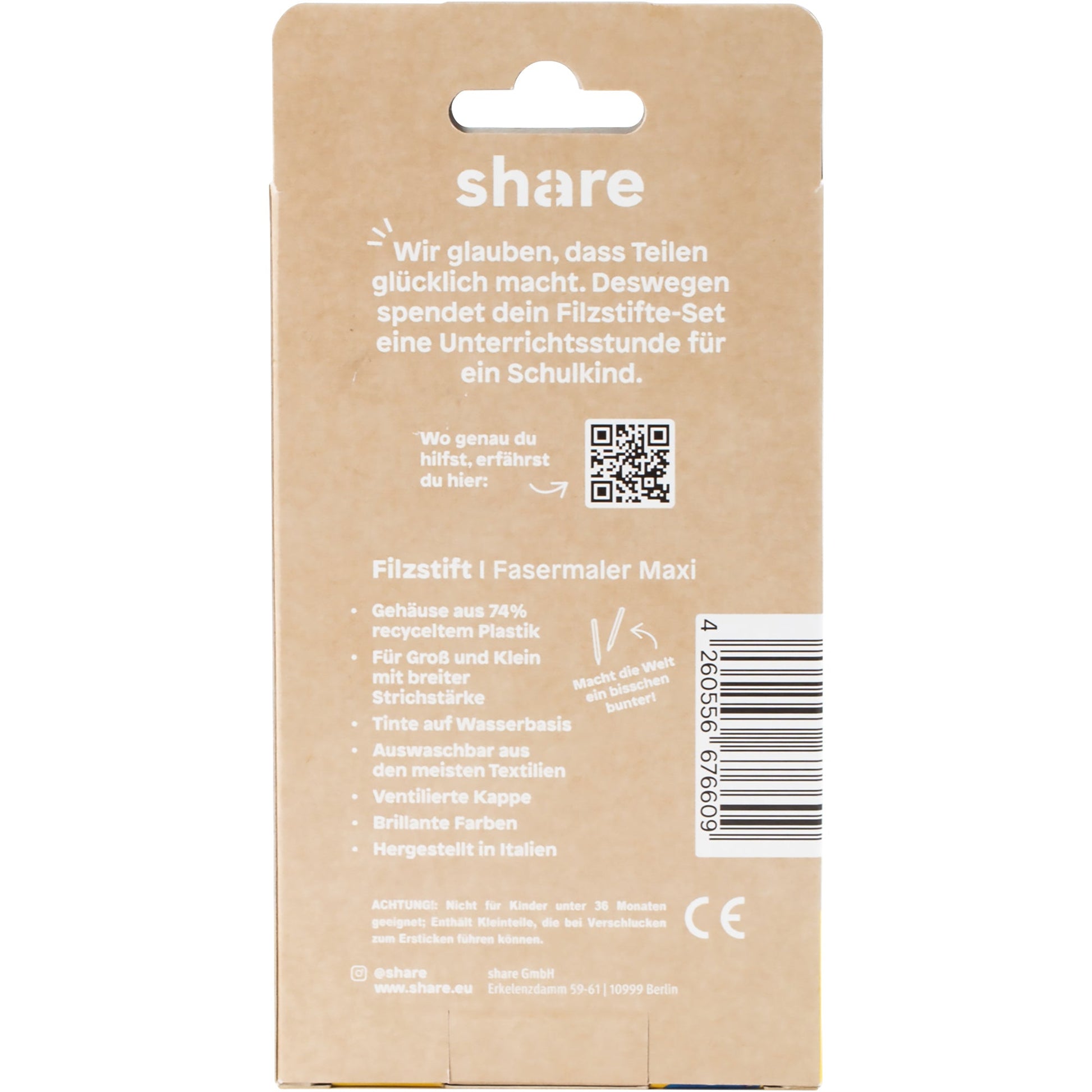 gelb, orange, rot, blau, grün, schwarzKaufen & spenden: Jede gekaufte share Schreibware spendet eine Unterrichtsstunde. Die Fasermaler Maxi fördern die Kreativität und liegen gut in kleinen Kinderhänden. Mit extra dickem Schaft und weicher, runder Spitze. Super auswaschbare Tinte, die sich leicht von der Haut und aus den meisten Textilien (bei 40 Grad) entfernen lässt. Die druckfesten Spitzen verhindern das Eindrücken in den Schaft. Die ventilierte Schutzkappe bietet Schutz vor Ersticken bei versehentlichem Verschlucken.