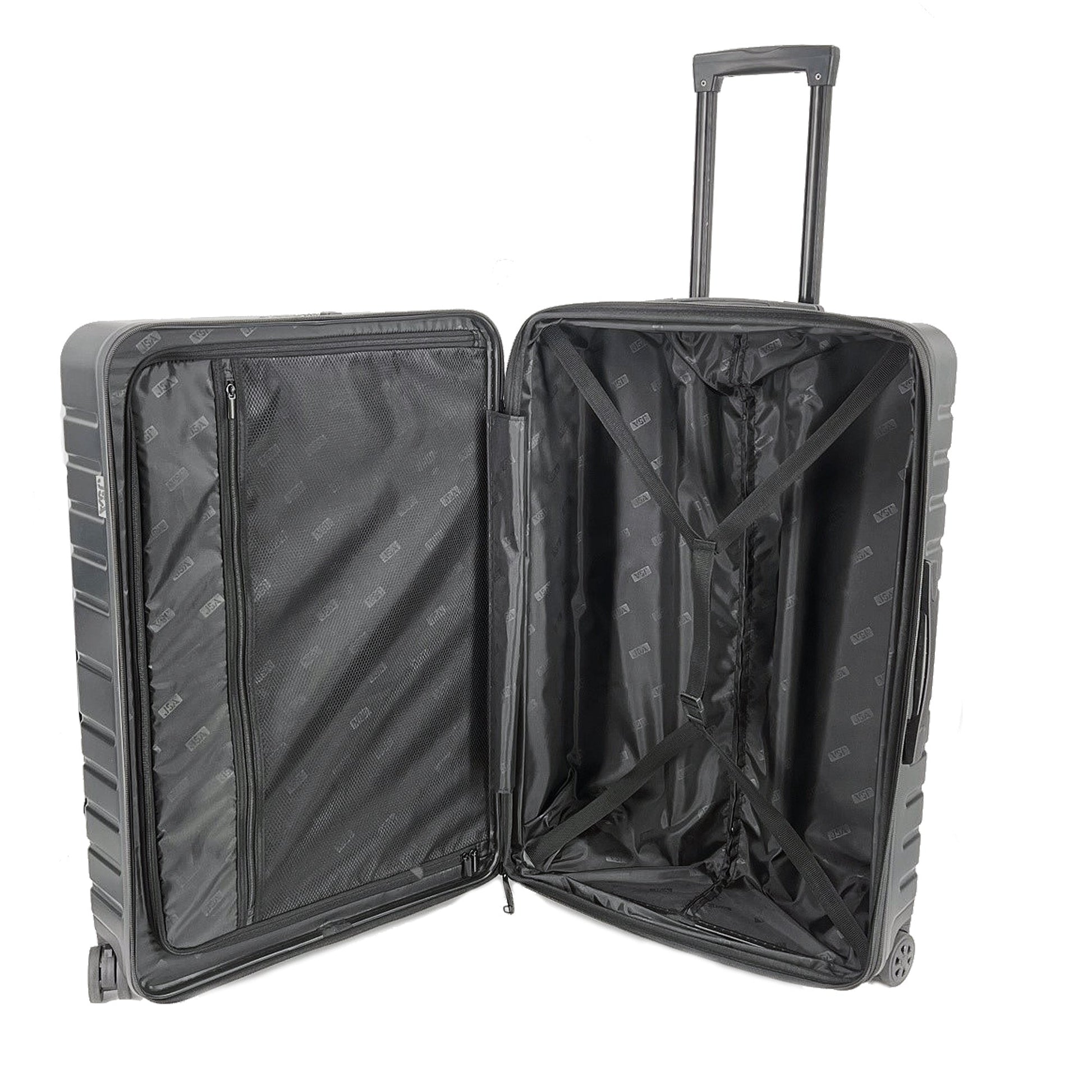 schwarzJSA Trolley L Innenmaße: 68 x 48 x 27 cm (B x H x T) Außenmaße: 75,5 x 50,5 x 29 cm (B x H x T) mit Rollen Arretierbares Teleskoptrolleysystem, Dehnfalte, vier 360 Grad Leichtlaufrollen, Beidseitige Packmöglichkeit durch Packtrennwand und Packgurt