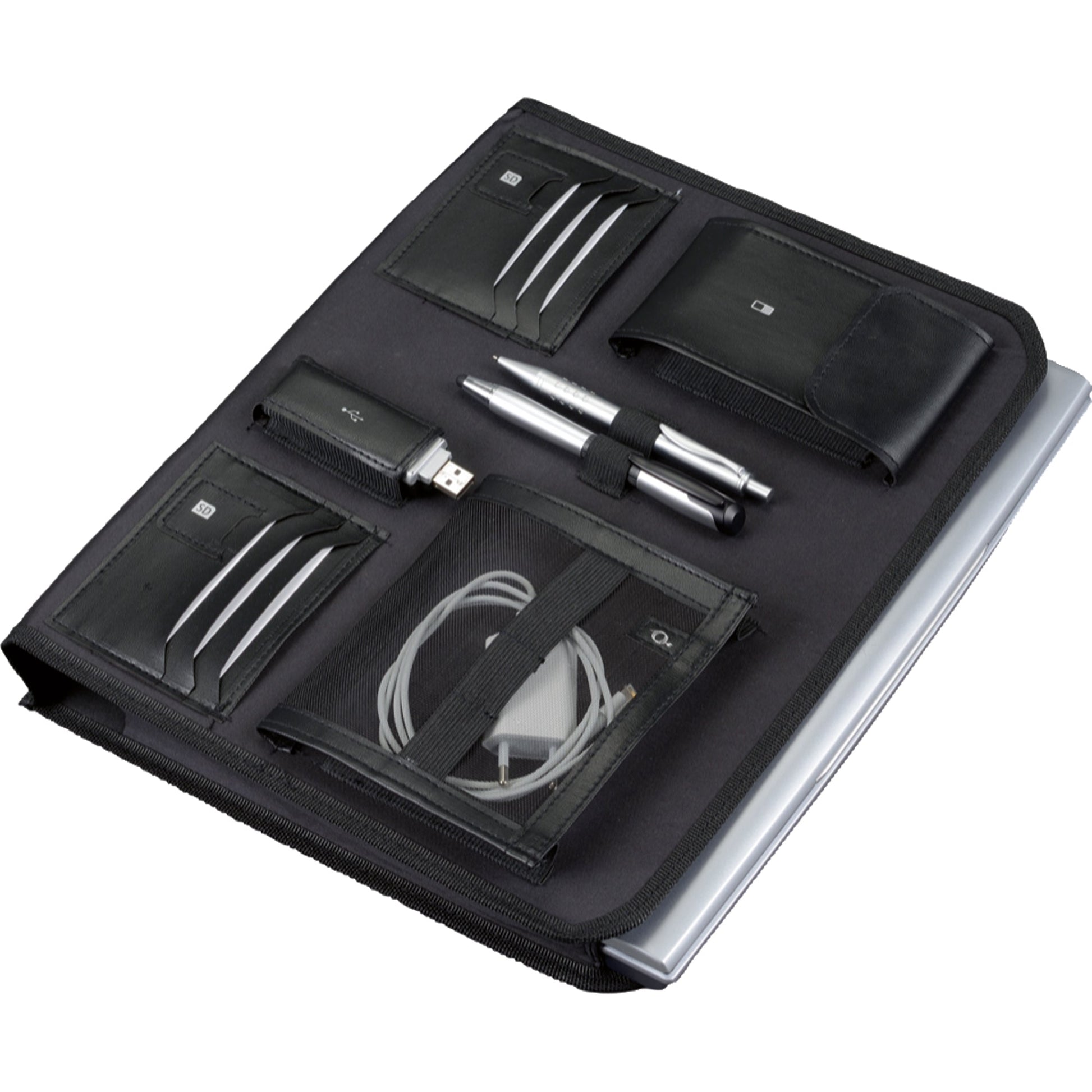 Ausführung des Inhalts (bzgl. der Hauptausstattungsteile): herausnehmbarem Inlay mit Tabletfach, Smartphone-Hülle, acht Visitenkarten-/Kreditkartenfächer, zwei Fächer für SD-Karten, Netzfach, Einsteckfach