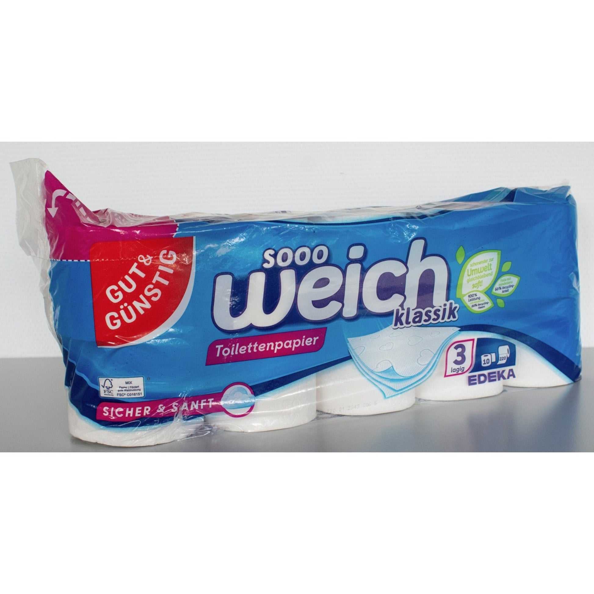 Bezeichnung: GUT & GÜNSTIG Toilettenpapier sooo weich Klassik 3-lagig weiß 220 Bl./Rl. 10 Rl./Pack.