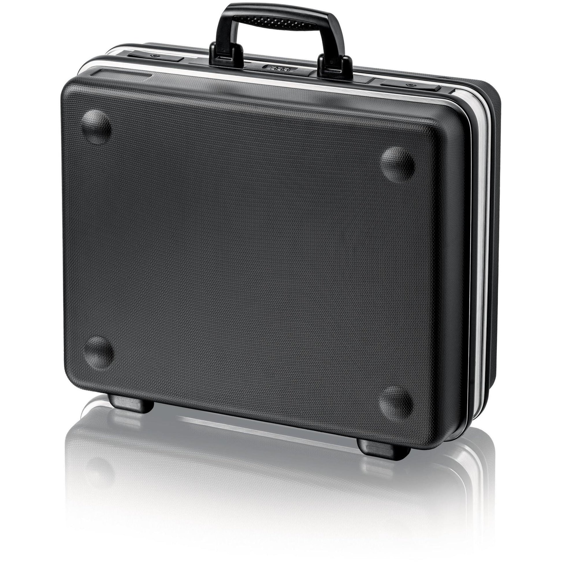 schwarzStrapazierfähige Ausführung mit umlaufender Rahmen. Dokumentenfach im Deckel. Zwei herausnehmbare Werkzeugtafeln aus schmutzabweisenden PP-Hohlkammerplatten mit 21 bestückbaren Werkzeugtaschen. Bodenschale, per Druckknopf fixierbar, Höhe 50 mm, durch Einsätze weiter unterteilbar und Abdecktafel mit zwölf großen Werkzeugtaschen und einem Flachfach. Zwei Metall-Kippschlösser und dreistelliges Zahlencodeschloss zum sicheren Verschließen des Deckels. Beschriftungsfeld mit zwei Aufklebern zur individuellen Kennzeichnung.