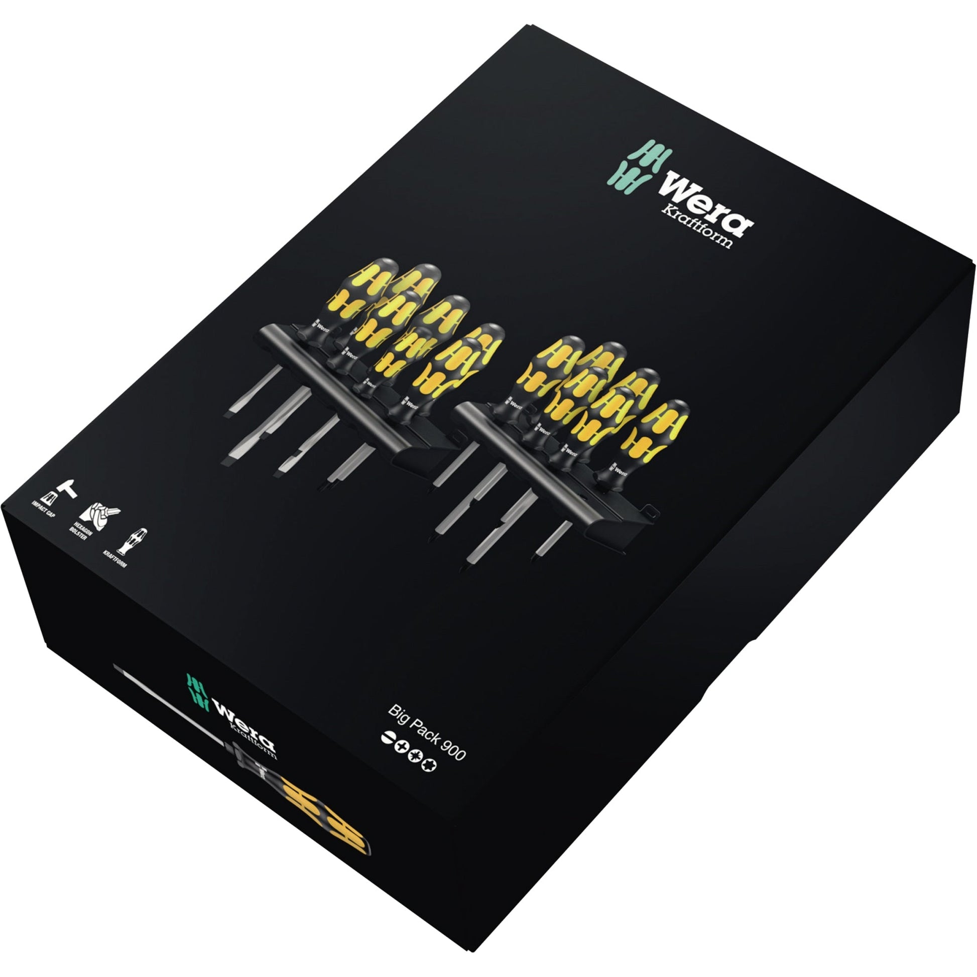 Bezeichnung: Wera Schraubendreher-Satz Big Pack 900 3 Kreuz-Schraubendreher (PH 1 x 80, 2 x 100, 3 x 150 mm) 5 Schlitz-Schraubendreher (0,6 x 3,5 x 80, 0,8 x 4,5 x 90, 1 x 5,5 x 100, 1,2 x 7,0 x 125, 1,6 x 9 x 150 mm) 2 Torx-Schraubendreher (TX 20 x 90, 25 x 100 mm)