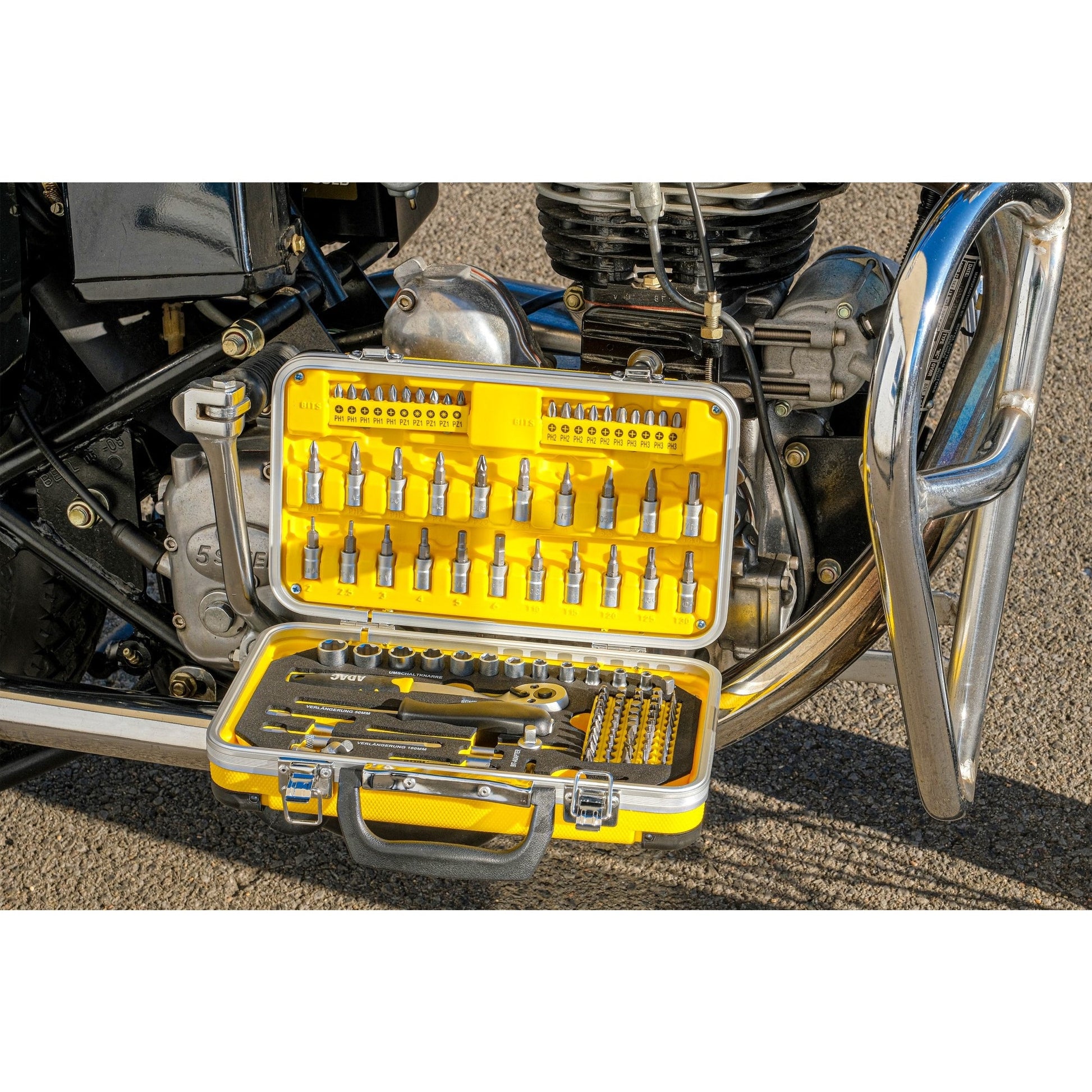 Inhalt: 70 Bits 25 mm (S2-Stahl): 15 x Kreuz: je 5 x PH1/PH2/PH3, 15 x Pozidriv: je 5 x PZ1/PZ2/PZ3, 14 x Flach: je 2 x 3/4/6/7 mm, je 3 x 5/5,5 mm, 14 x Innensechskant.: je 2 x 2/2,5/3/4/5/5,5/6 mm, 12 x T-Profil: je 1 x T10/T15/T35/T40, je 2 x T20/T25/T27/T30, 4 x Winkelschraubendreher für Innensechskant: 1,27/1,5/2,0/2,5 mm, 1 magnetischer Bithalter (60 mm), 1 Bit-Adapter, 1 Umschaltknarre 6,3 mm (1/4“) 72 Zähne, 1 Schraubgriff für Steckschlüsseleinsätze (6,3 mm), 12 Steckschlüsseinsätze (CrV): 4/4.5/5/5.5/6/7/8/9/10/11/12/13 mm, 21 Schraubklingen-Einsätze (S2-Stahl): 3 Kreuz: PH1/PH2/PH3, 3 Flach: 4/5.5/6.5 mm, 3 Pozidriv : PZ1/PZ2/PZ3, 6 T-Profil: T10/T15/T20/T25/T30/T40, 6 Innensechskant: 2/2,5/3/4/5/6 mm, 2 Verlängerungen 6,3 mm (1/4“): 50/100 mm, 1 T-Gleitgriff, 6,3 mm (1/4“), 1 Steckschlüssel-Adapter 6,3 mm (1/4“), 1 Kardangelenk, 6,3 mm (1/4“).