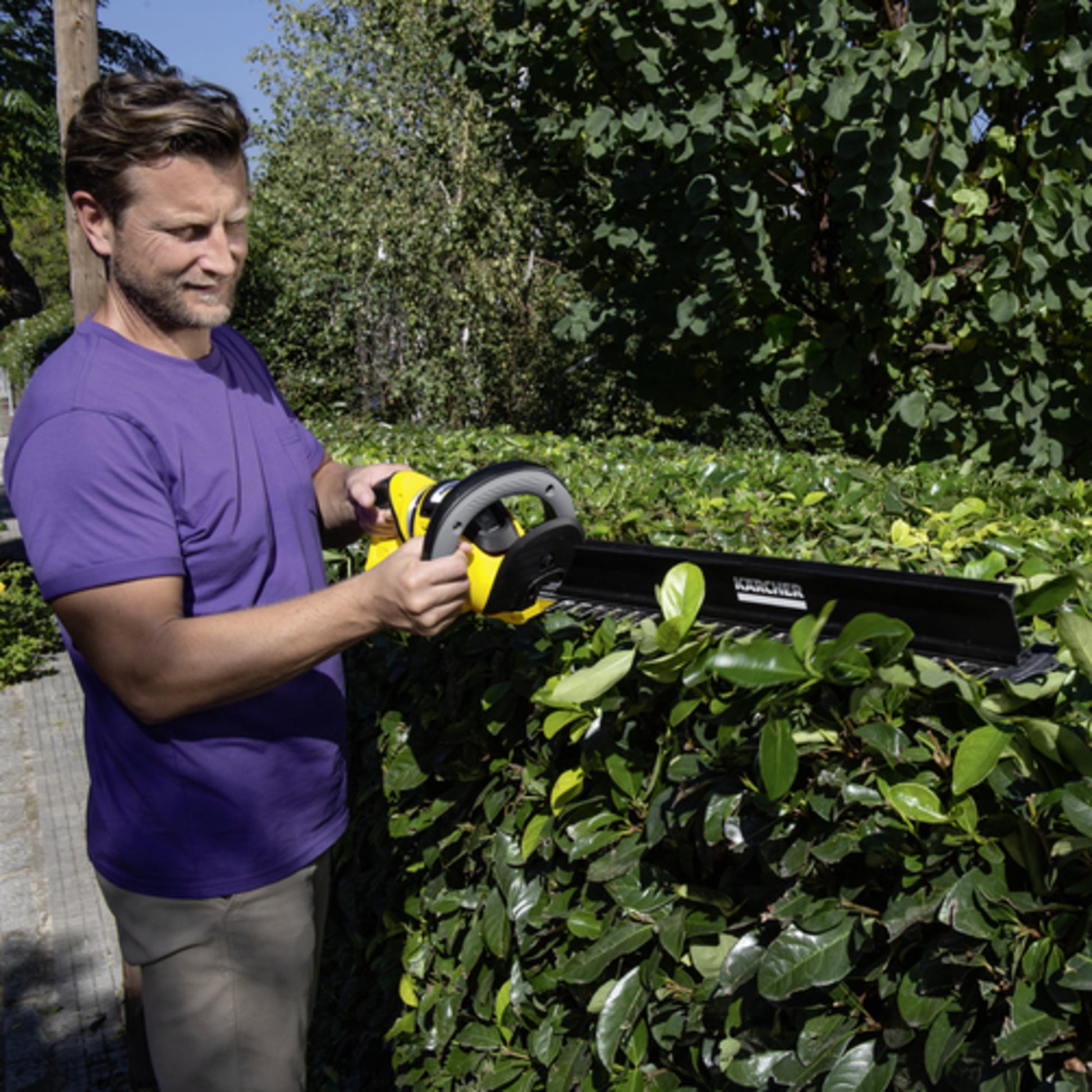 gelbDie Kärcher Heckenschere HGE 36-60 Battery ohne Akkupack ist die ideale Lösung für alle, die ihre Hecken präzise und mühelos schneiden möchten. Mit einer Schnittlänge von 60 cm und einem Messerabstand von 26 mm bietet diese Heckenschere eine beeindruckende Leistung und ermöglicht saubere Schnitte auch bei dichten Hecken. Dank der kabellosen Stromversorgung durch einen Akku (nicht im Lieferumfang enthalten) genießen Sie maximale Bewegungsfreiheit und Flexibilität bei der Gartenarbeit. Das geringe Gewicht von nur 3,3 kg sorgt dafür, dass die Heckenschere leicht zu handhaben ist und auch bei längeren Einsätzen nicht ermüdet. Dank der 2-stufigen Geschwindigkeitsregulierung kann je nach Anwendung zwischen maximaler Geschwindigkeit und maximaler Kraft gewählt werden. Zudem lassen sich mit der Sägefunktion auch dickere Äste mühelos schneiden. Ein weiteres Highlight ist der in mehreren Stufen um 180° drehbare Handgriff, der ein Ermüden der Arme oder Schultern verhindert. Ebenfalls praktisch: der aufsetzbare Schnittgutkehrer, der den Heckenschnitt direkt auf den Boden befördert, statt ihn in die Hecke fallen zu lassen. Das lasergeschnittene und diamantgeschliffene Messer der Heckenschere garantiert jederzeit ein präzises Schnittergebnis. Der zusätzliche Messerspitzenschutz verhindert sowohl Beschädigungen von Gebäuden und Böden als auch Schäden am Messer selbst. Und die im Messerspitzenschutz integrierte Aufhängeöse ermöglicht eine platzsparende Aufbewahrung an der Wand. Keine Hersteller- und keine Verkäufergarantieansprüche bei gewerblicher Nutzung.