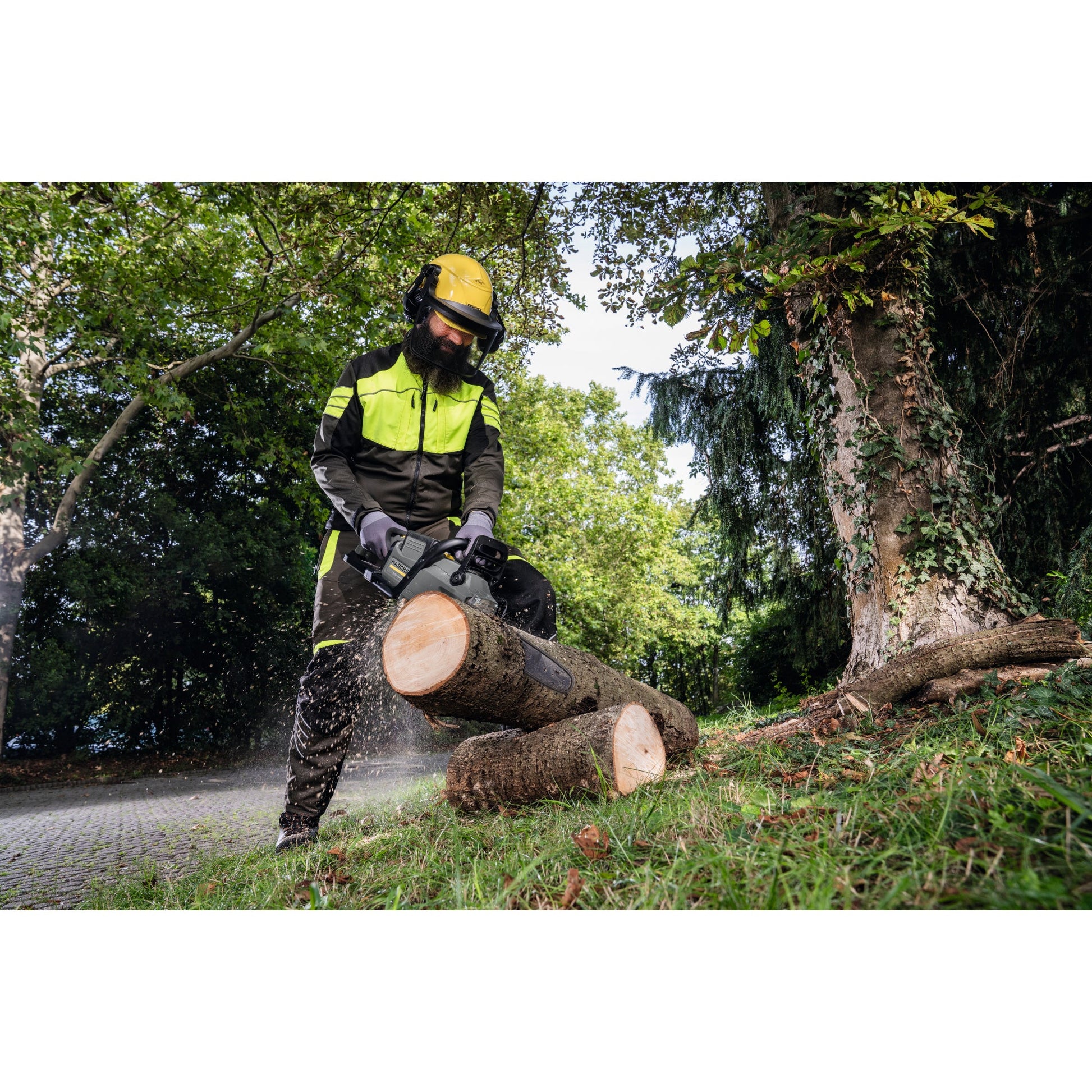 Kraftvoll im täglichen harten Arbeitseinsatz bei der Grundstückspflege, bei Garten- und Aufräumarbeiten nach Unwetterschäden, kleineren Forsttätigkeiten oder bei Verschönerungsmaßnahmen in Parks und innerstädtischen Bereichen: die robuste Akku-Kettensäge CS 400/36 Bp von Kärcher. Perfekt ausbalanciert liegt sie ergonomisch und vibrationsarm in der Hand, arbeitet völlig ohne Abgase und auch geräuschärmer als benzinbetriebene Maschinen und überzeugt im Vergleich mit deutlich geringeren Betriebs- und Wartungskosten.