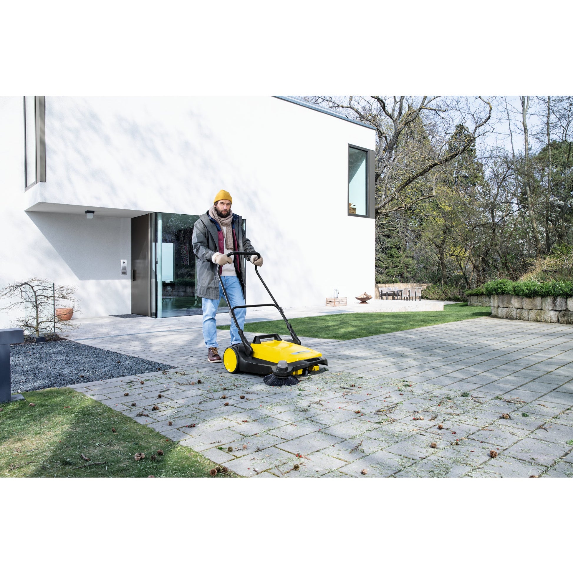 gelbOb Frühling, Sommer, Herbst oder Winter - die neue Kehrmaschine S 6 von Kärcher eignet sich für die ganzjährige Reinigung rund um Haus und Garten. Sie ist effektiv: Dank ihrer kräftigen Kehrwalze, ihrem Seitenbesen und ihrer Kehrbreite kehrt sie mühelos große Flächen. Sie ist ergonomisch: Der Schubbügel lässt sich einfach in 2 Positionen einstellen, ohne dass man sich bücken muss, und lässt sich damit optimal auf die Körpergröße des jeweiligen Anwenders anpassen. Und sie ist sauber: Das Kehrgut landet direkt im Kehrbehälter, der bei der Entleerung keine schmutzigen Hände verursacht. Ein weiteres Highlight ist die zusätzliche Höhenverstellung des Seitenbesens, die eine Anpassung des Anpressdrucks auf jedes Kehrgut - und damit optimale Kehrergebnisse - ermöglicht. Außerdem kann die S 6 ganz einfach durch eine Trittfläche am Rahmen komplett umgeklappt und platzsparend aufbewahrt werden. Dank werkzeugloser Seitenbesenanbringung ist die Kehrmaschine im Nu einsatzbereit. Keine Hersteller- und keine Verkäufergarantieansprüche bei gewerblicher Nutzung.