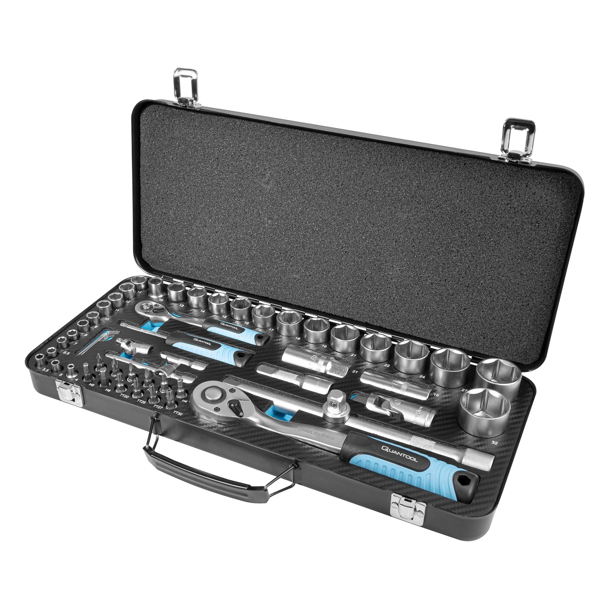 Bezeichnung: QUANTOOL Steckschlüssel-Satz 56 Teile Steckschlüssel: Chrom-Vanadium Stahl, Bits/Winkelschraubendreher: S2-Stahl, brüniert