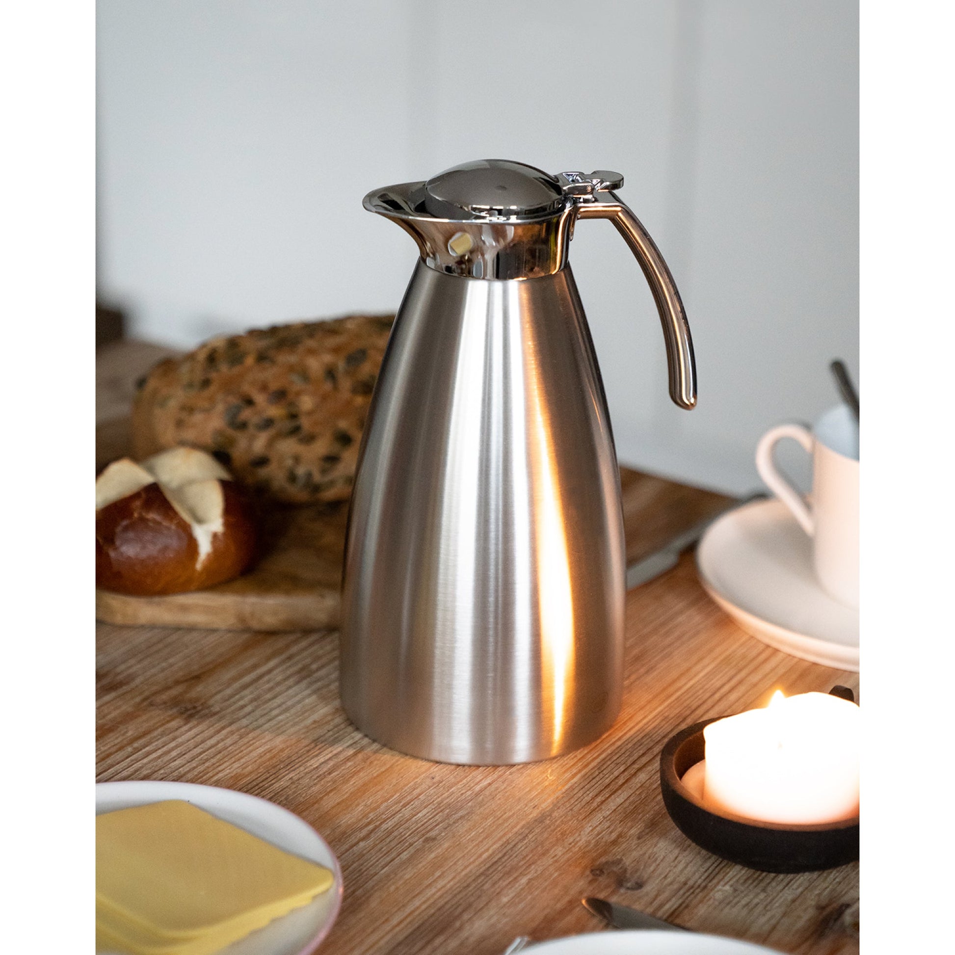 silberGUSTO TT von alfi ist das Sinnbild einer klassischen Premium-Isolierkanne. Für beste Isolierleistung und mit Einhandbedienung für komfortables Eingießen von Kaffee- und Teespezialitäten. Unzerbrechlicher vakuumgepumpter Toptherm Isolierkörper Hält bis zu 12 Stunden Heiß und 24 Stunden kalt. Ab Kaufdatum 2 Jahre Garantie auf Material und Verarbeitung sowie 5 Jahre Garantie auf die Isolierleistung. Schlag- und bruchfest.