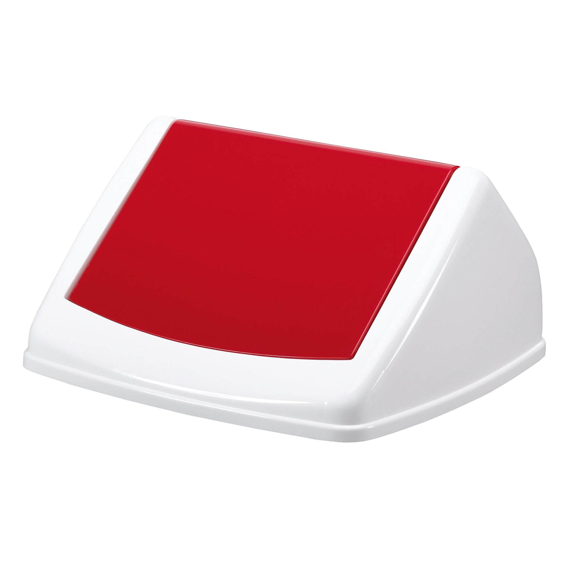 weißAbfall- und Wertstoffbehälter in Rechteckform. Ideal für Müllsammlung und Recycling-Materialien. Farbiger Deckel mit schwenkbarer Einwurfklappe.