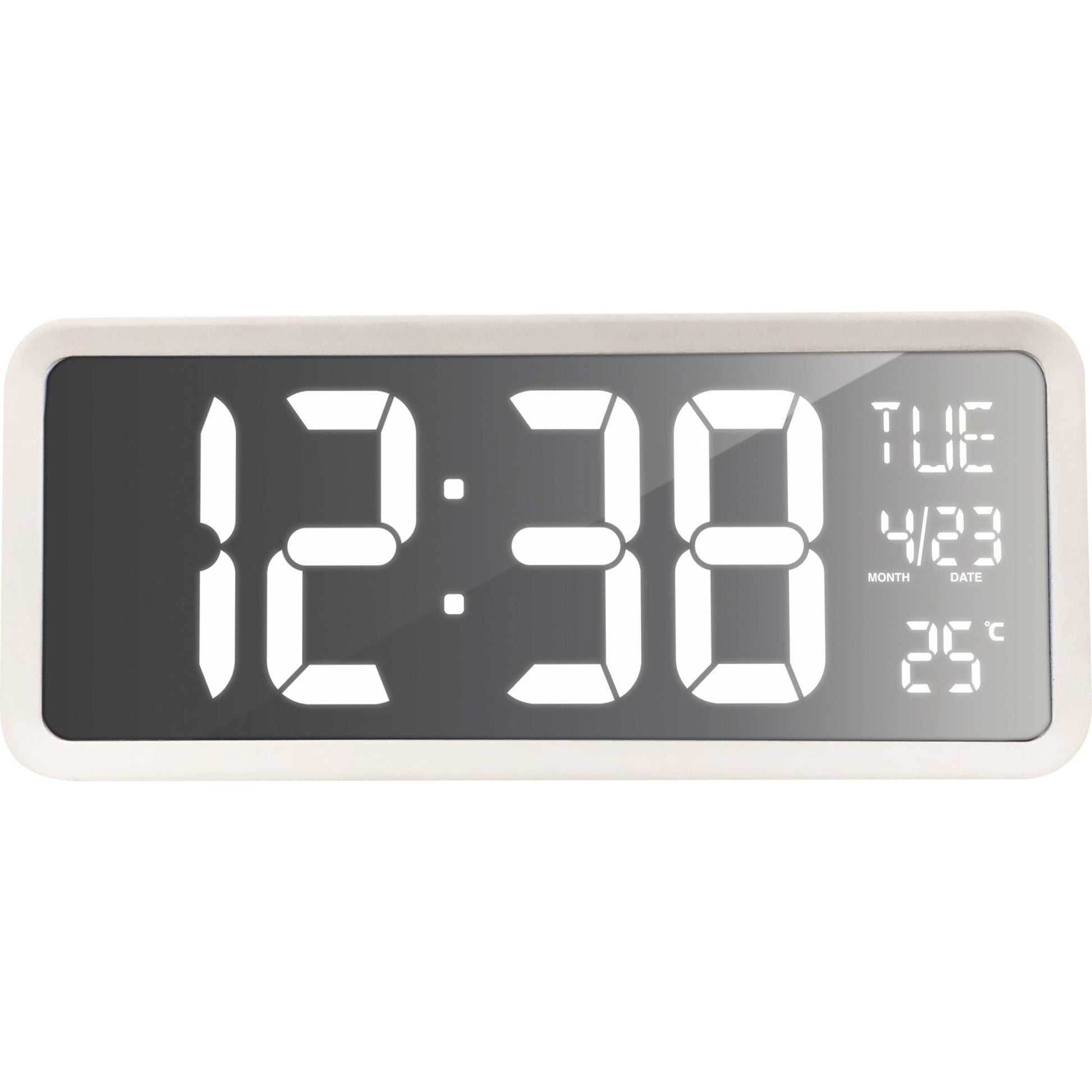 weißDatums- und Wochentagsanzeige (3 Sprachen). Dimm-Sensor. Dauerbeleuchtung nur mit Netzteil. Großes Spiegel-Display. Wandaufhängung oder Tischaufstellung.