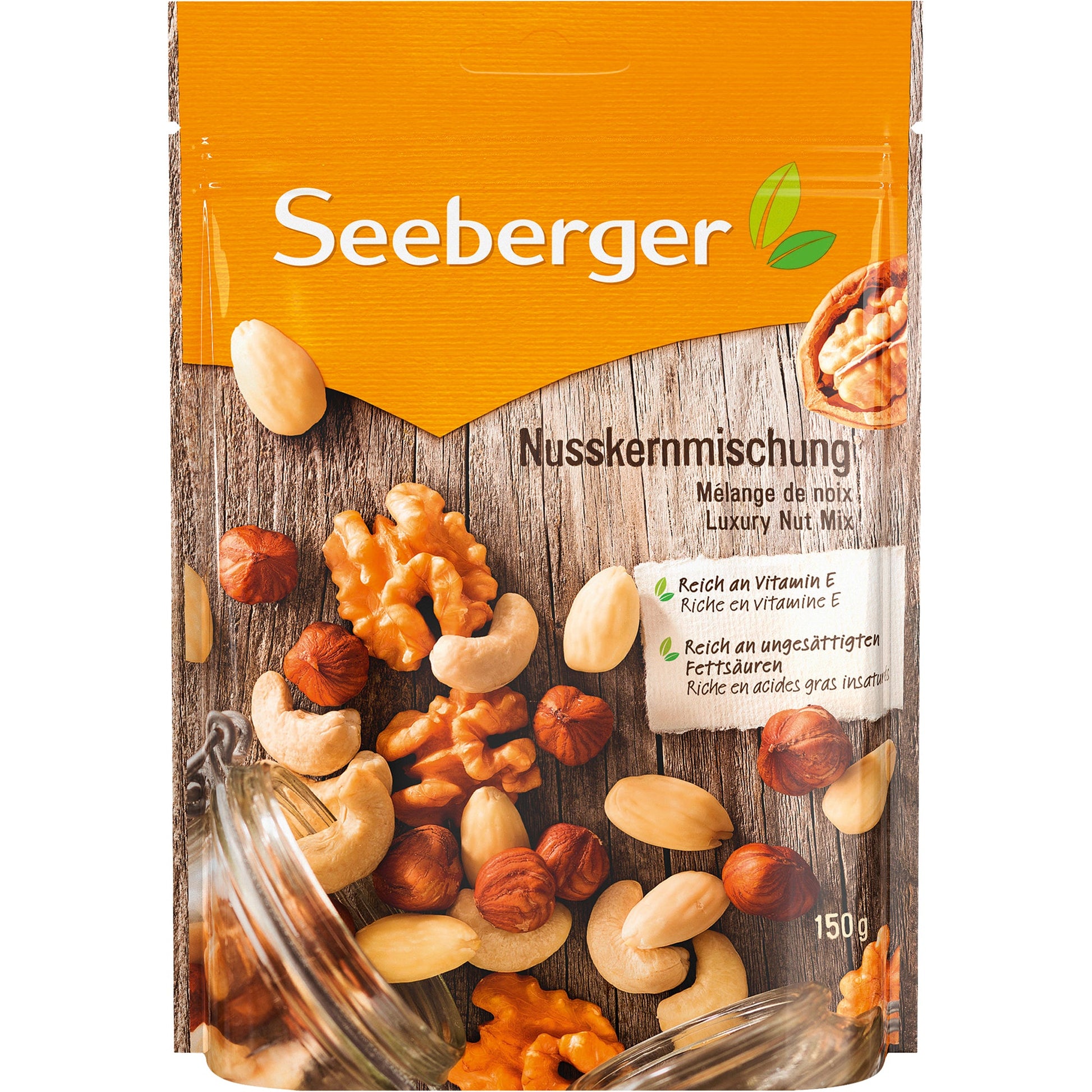 Bezeichnung: SEEBERGER Nussmischung Haselnusskerne, Mandeln blanchiert, Cashewkerne, Walnusskerne 150 g/Pack.