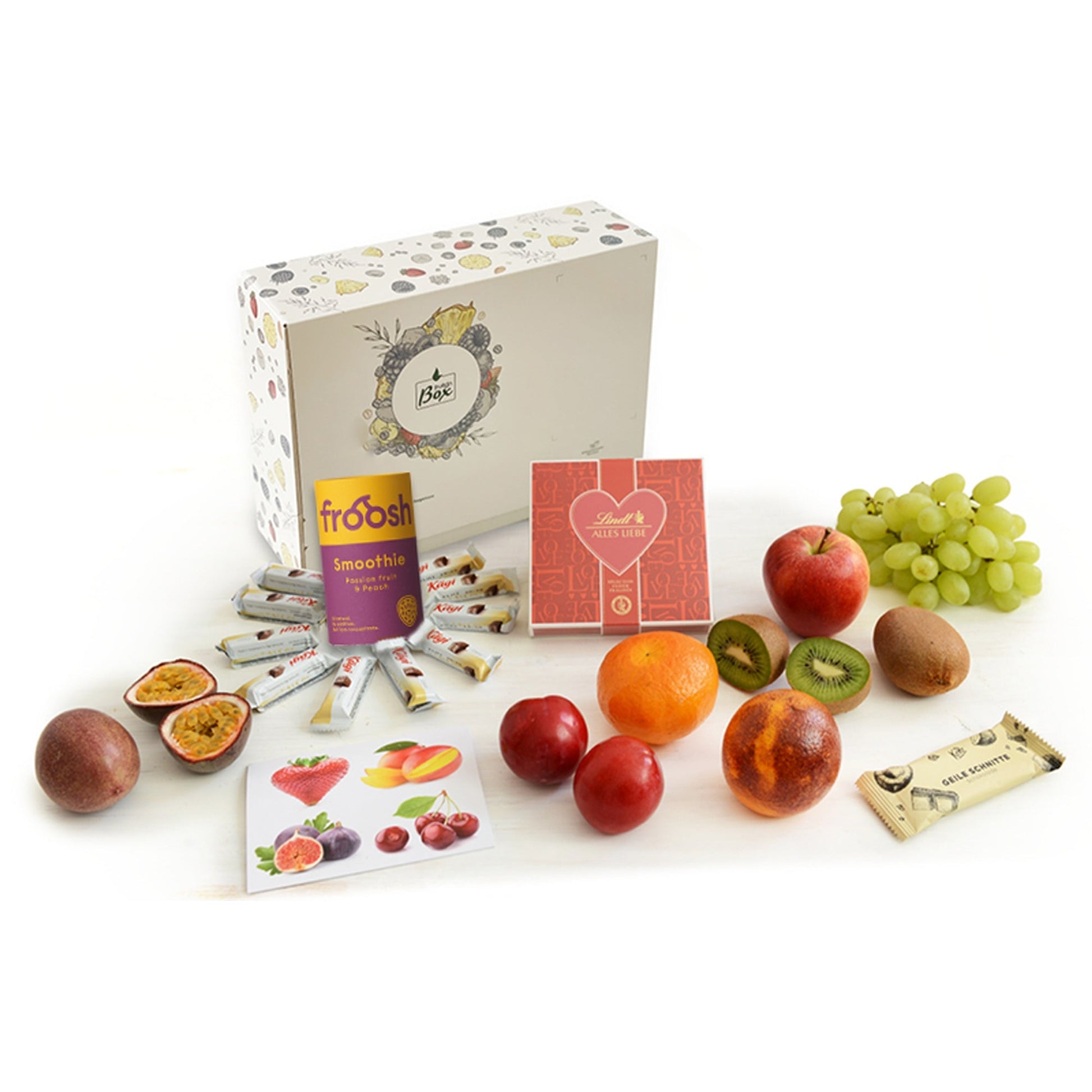 Ausführung des Inhalts (bzgl. der Hauptausstattungsteile): 2 x Passionsfrüchte, kernlose Weintrauben (250 g), 3 x saisonale Früchte, 2 x Kiwis, 1 x Apfel, 1 x feine "Alles Liebe"-Pralinés von Lindt (80 g) oder "Liebe" Pralinen von Niederegger (100g) je nach Verfügbarkeit, 1 x "Geile Schnitte" Kokosriegel mit Schokoladenüberzug (30 g), 10 x Mini-Schokowaffeln (6,4 g), 1 x Smoothie (150 ml), 1 x Grußkarte
