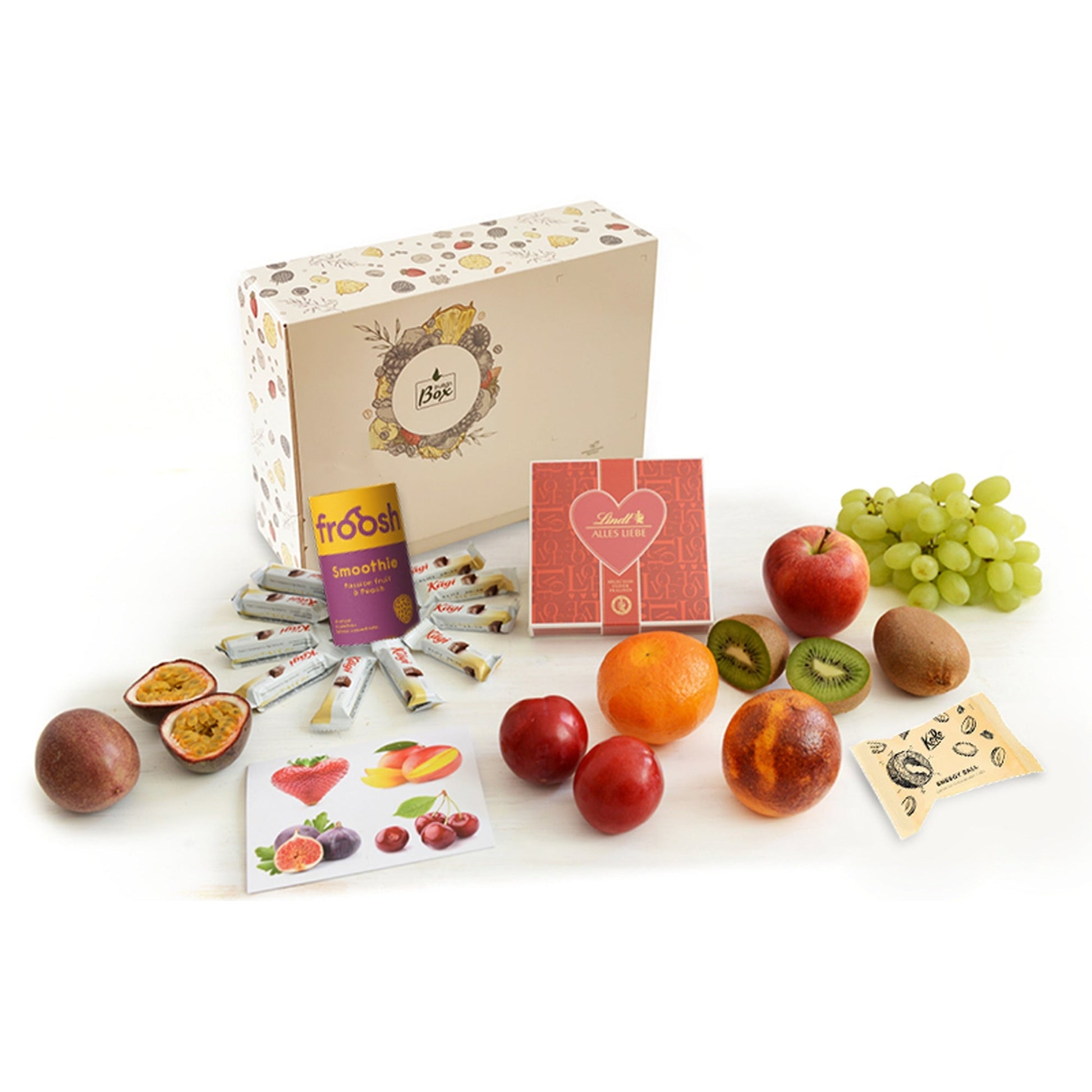 Ausführung des Inhalts (bzgl. der Hauptausstattungsteile): 2 x Passionsfrüchte, kernlose Weintrauben (250 g), 3 x saisonale Früchte, 2 x Kiwis, 1 x Apfel, 1 x feine "Alles Liebe"-Pralinés von Lindt (80 g) oder "Liebe" Pralinen von Niederegger (100 g) je nach Verfügbarkeit, 1 x Energy Ball Erdnuss (30 g), 10 x Mini-Schokowaffeln (6,4 g), 1 x Smoothie (150 ml), 1 x Grußkarte