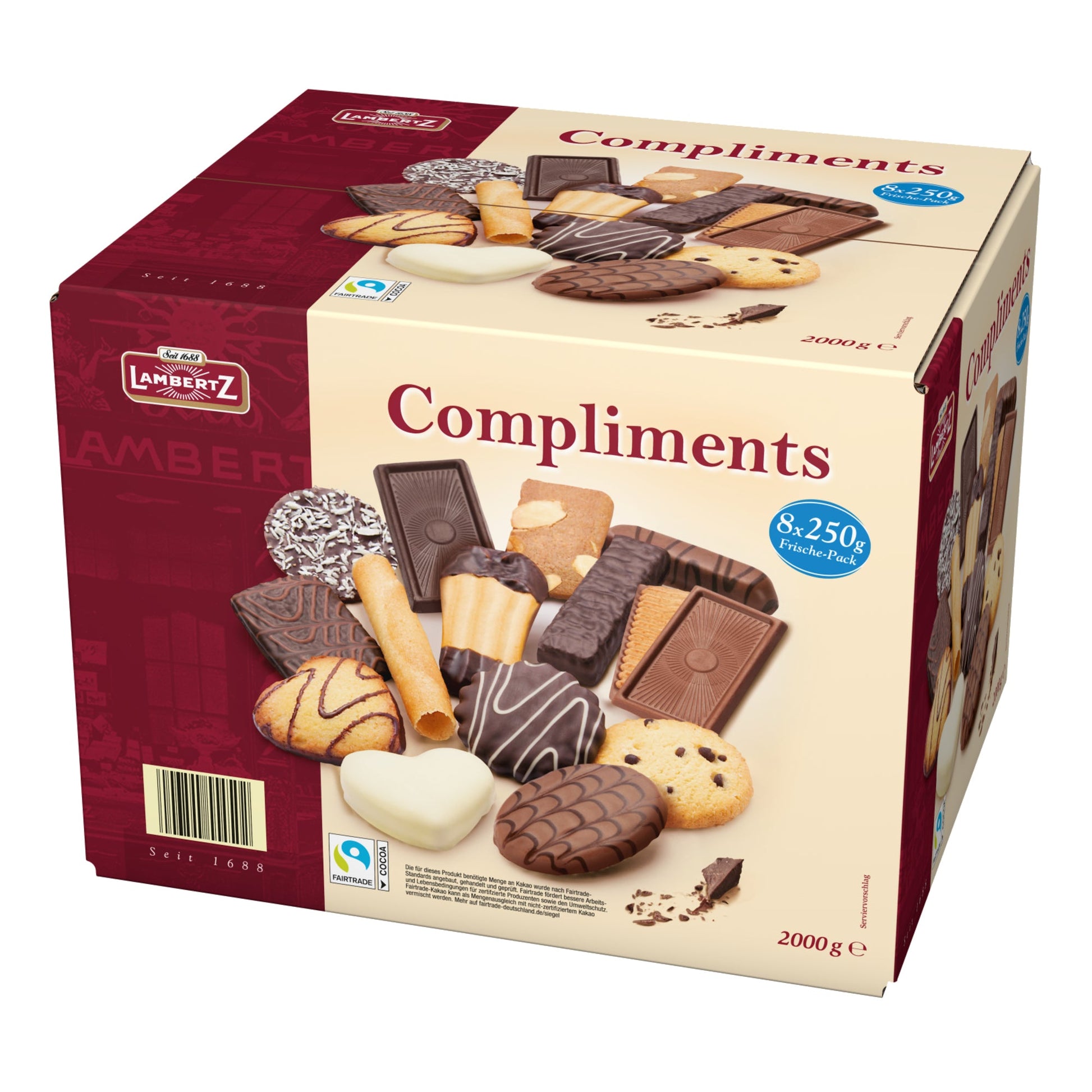 Bezeichnung: Lambertz Gebäckmischung Compliments Lambertissimo Limone, Divina, Craquer, Kaffeestäbchen, Butterherz mit Zartbitterschokolade, Sonnenkeks, Neapolitaner, Coco-Fleur, Karamellstäbchen, Nocciola, Donna Zartbitter, Chockies, Balena Karton 8 x 250 g/Pack.