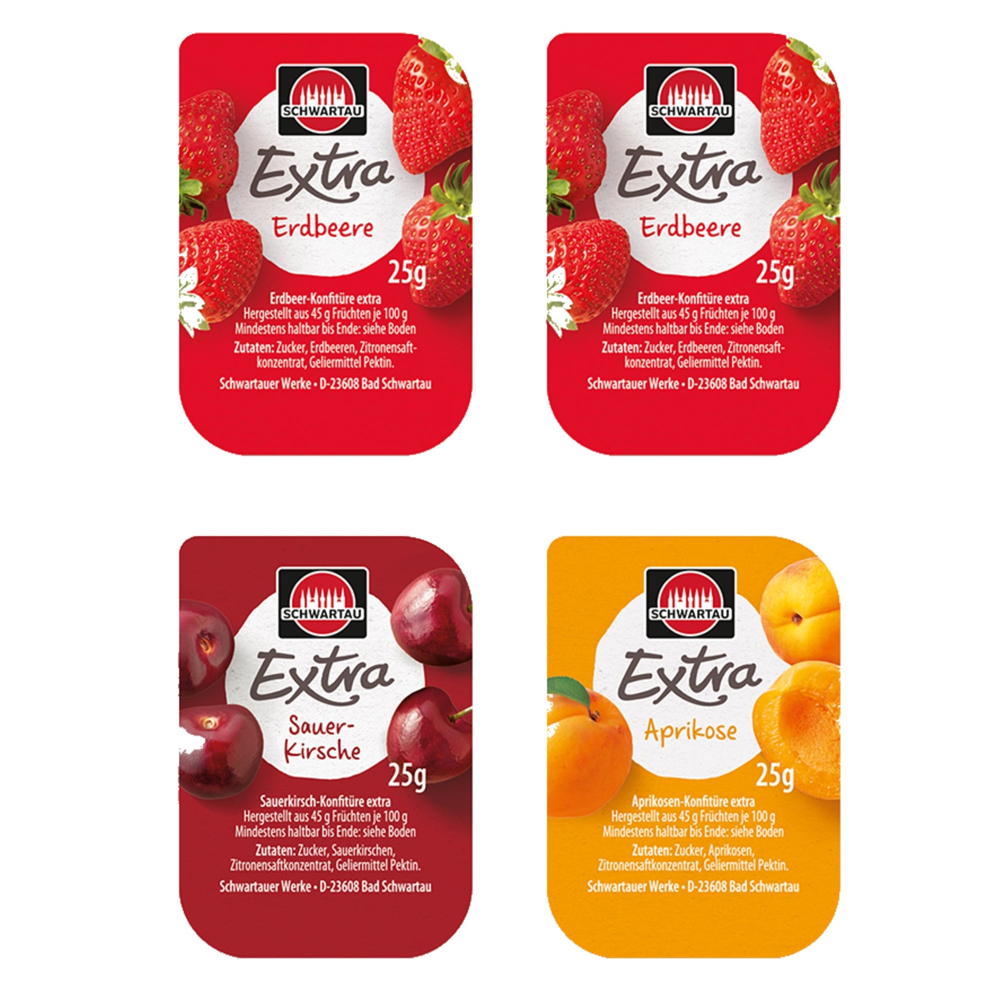 Bezeichnung: Schwartau Brotaufstrich Extra Konfitüre 50 x Erdbeere, 25 x Aprikose, 25 x Sauerkirsche Portionsschale 100 x 25 g/Pack.
