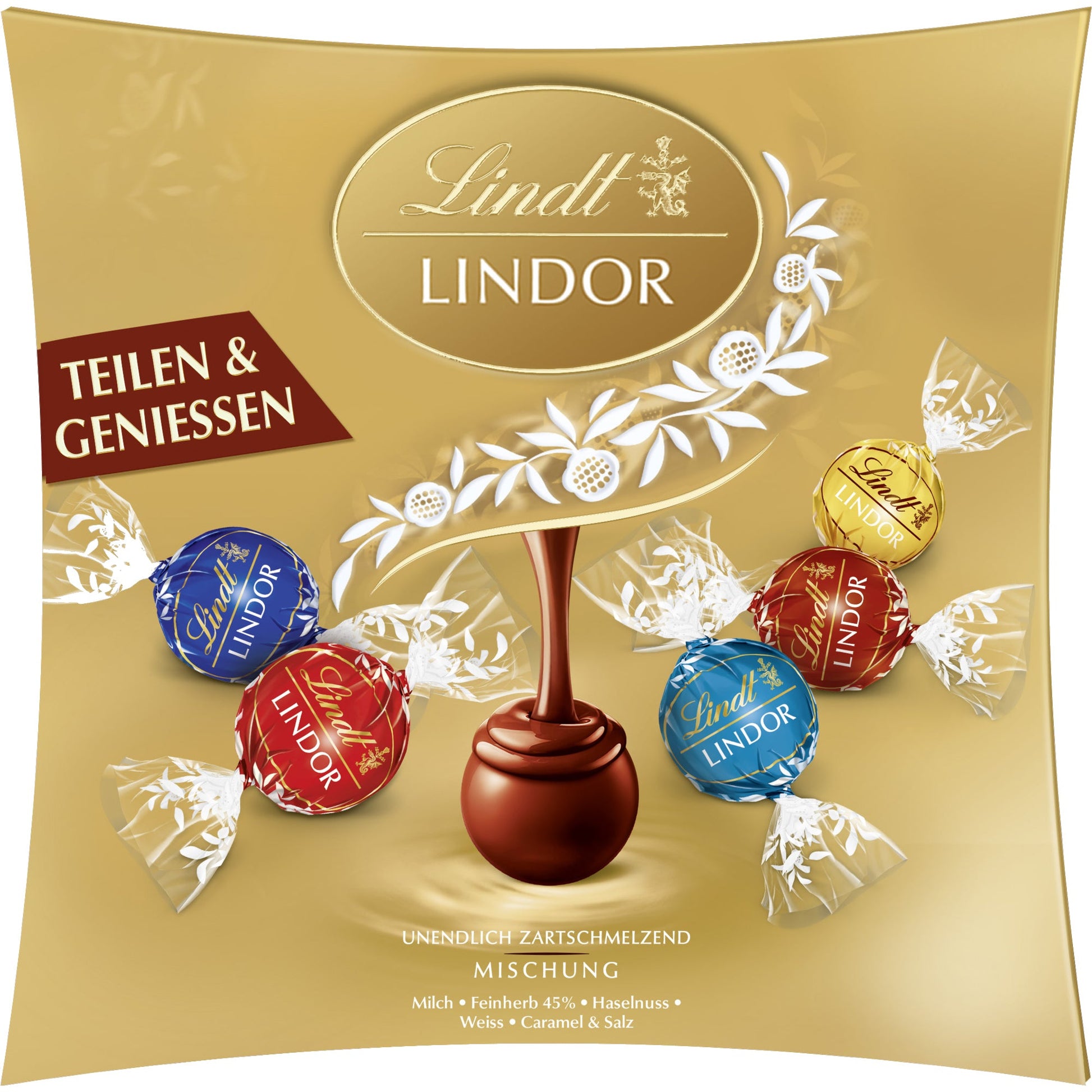 Bezeichnung: Lindt Pralinen LINDOR Schokokugeln Sharing Box Milchschokolade, Feinherb, Caramel & Salz, Weiße Schokolade, Haselnuss 250 g/Pack.