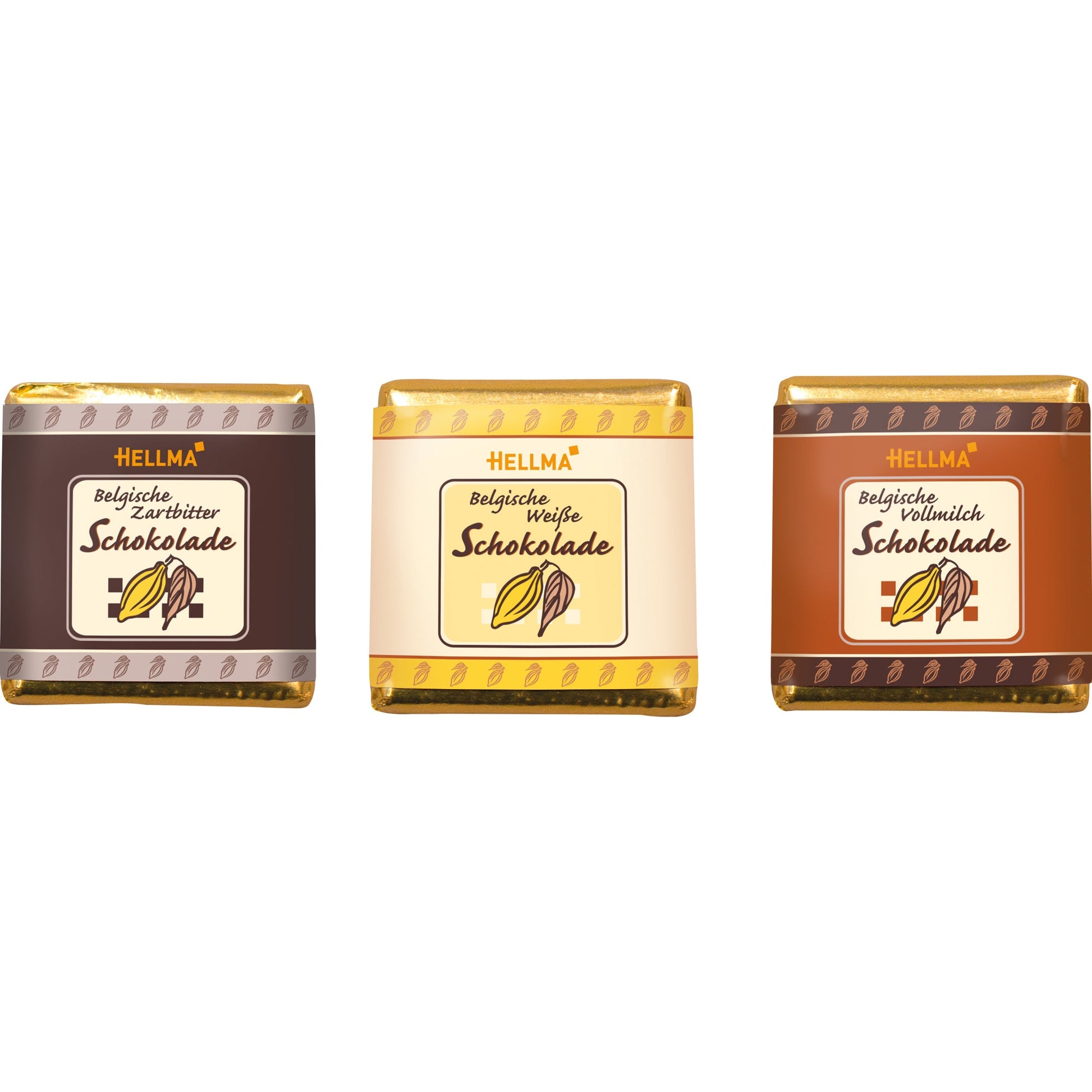 Bezeichnung: Hellma Schokolade Belgische Täfelchen Zartbitter, Vollmilch, weiße Schokolade 130 x 4,5 g/Pack.